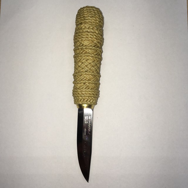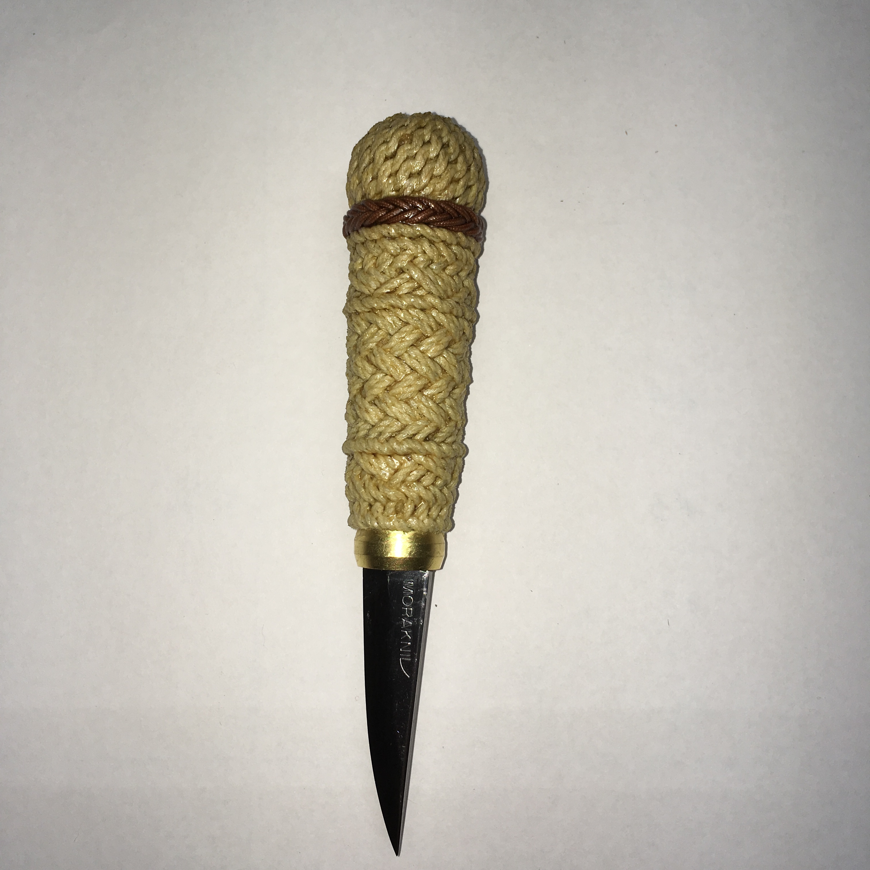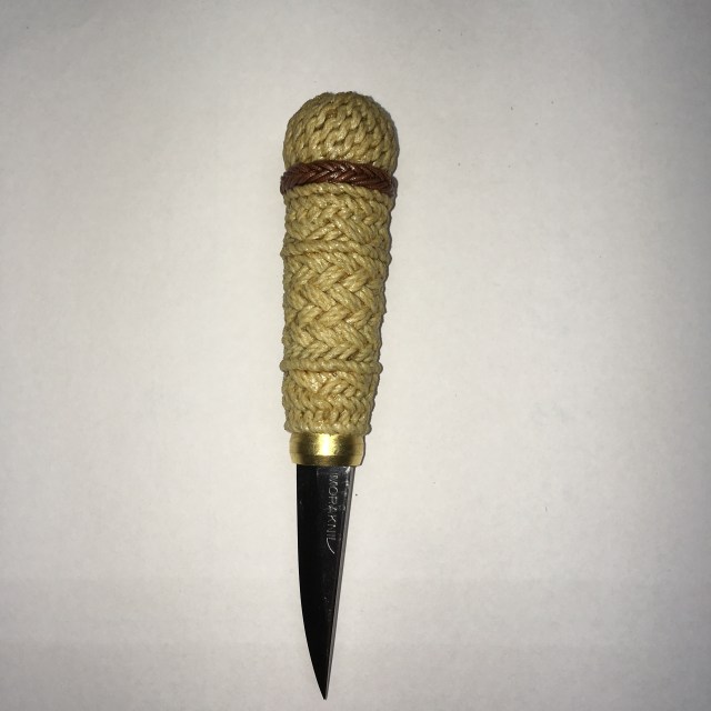 I started out with some handle work on a couple of knives to give as Christmas presents. This involved a needle hitching technique that I’ve used many times before with a couple of Turkshead knots to dress things up.
