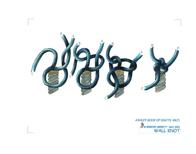 The wall knot is the reverse of the crown knot. Like the crown knot, the wall knot is of limited use by itself. However, when used is combination with other knots, the wall knot is the basis for a number of practical and decorative knots. I have shown the knot tied with three strands but it can be tied in any multiple number of strands. I find that three strands are ideal for learning this knot.