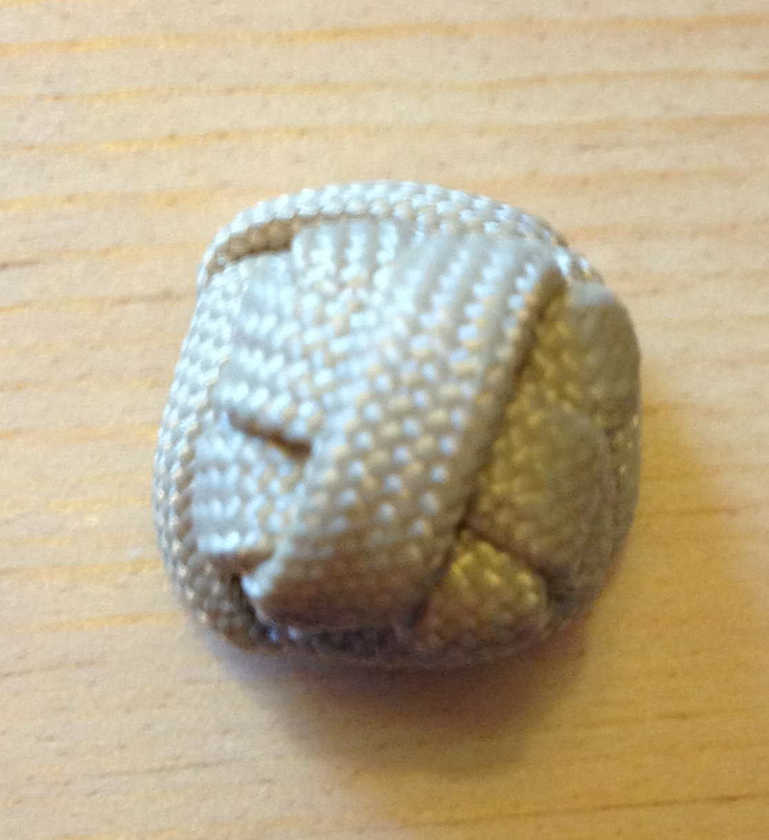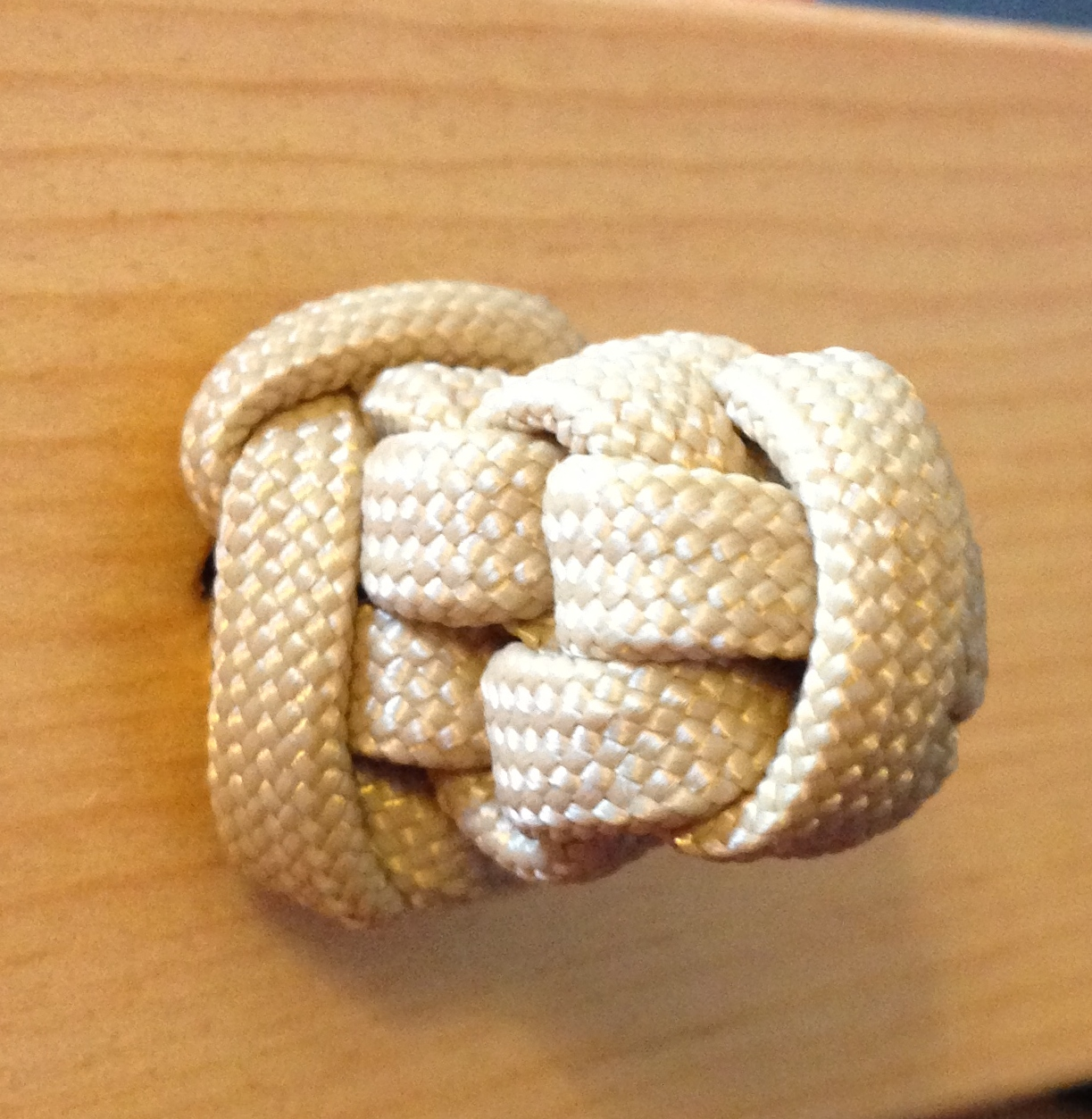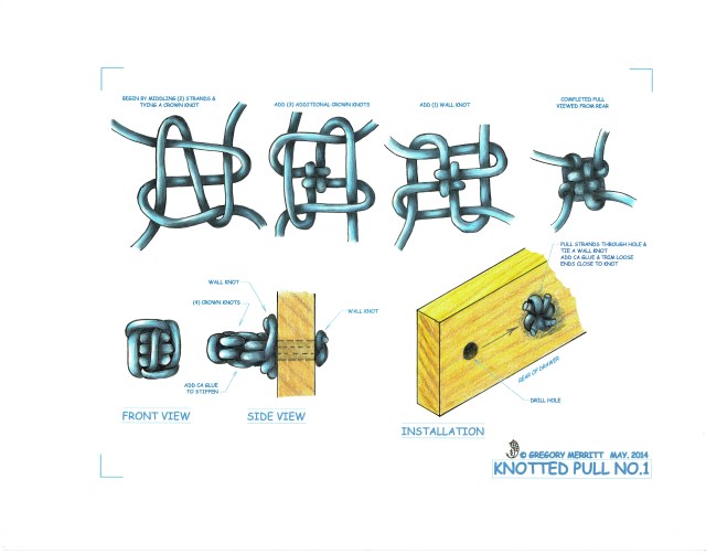 I usually use #72 tarred nylon twine when making my pulls. It generally results in a completed pull that is the right size for small drawers and cabinet doors. Tied in #72 twine this pull is 1″(25mm) long and 5/8″(16mm) square at the base. Of course I encourage you to experiment with different cordage types and sizes to find what you like best.