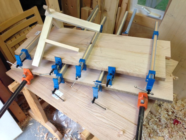 I managed to get two panels edged and glued together. Which means I promptly ran out of clamps. So while those are curing I’m on hold until tomorrow for the other two panels. I’m not sure why, but I do not enjoy gluing up panels. There is nothing difficult about it, I just don’t enjoy it.