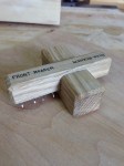 I went through several design sketches, some simple, some not so much.  Eventually I distilled everything down to a simple double ended gauge that works beautifully.  I set the pins at 45deg, same as with the other gauges I make.  The beam and fence are joined in a simple lap joint configuration that locks the two pieces 90deg to each other.  The joint is compression fit, but I added a little glue for insurance.  The pins are finish nails and easy to file and can be removed and replaced, when the need arrises.  Simple and effective.