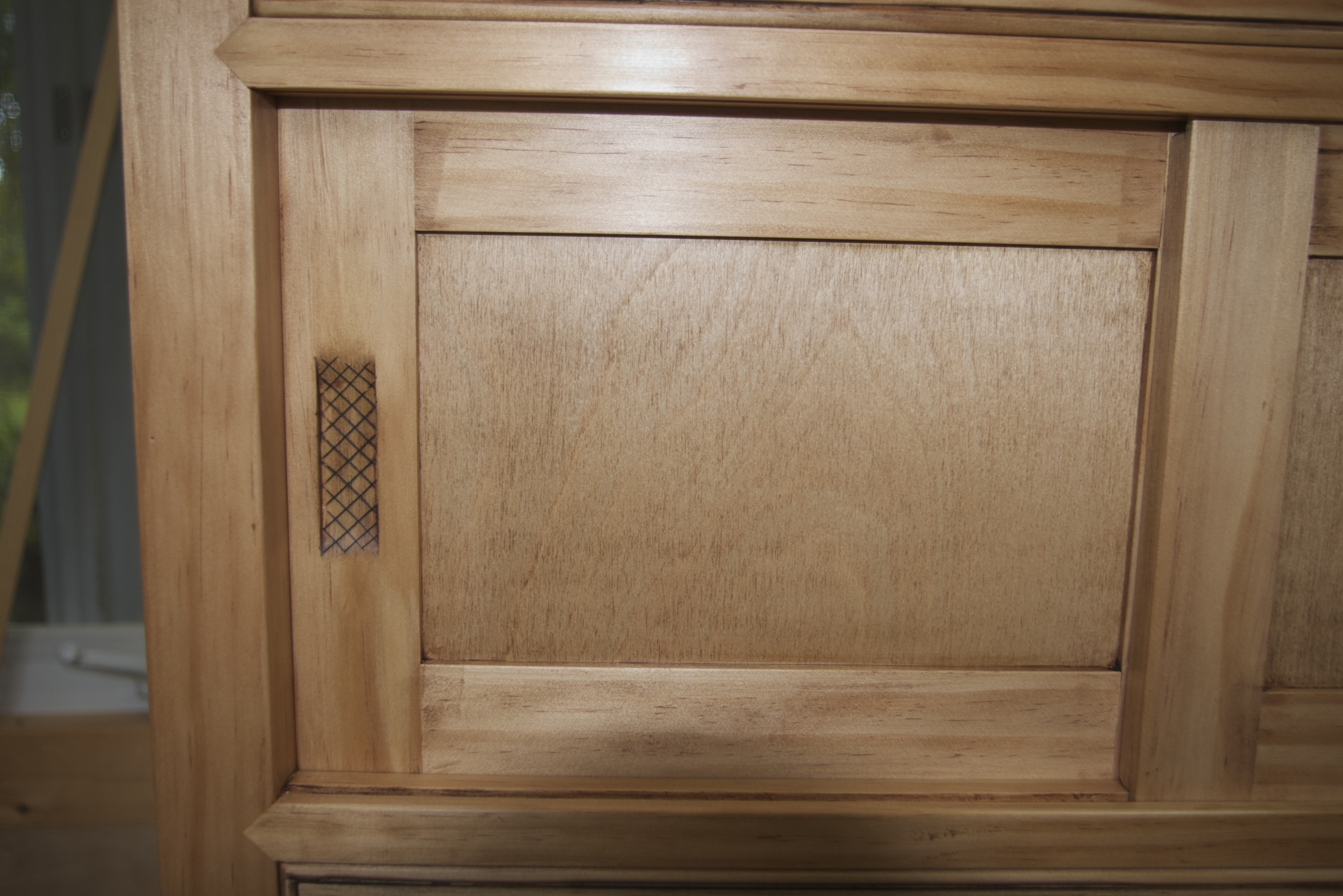 The traditional Japanese method is to inset a purpose made piece, rectangular or round, into the panel itself. I did find a few sources where I could purchase the necessary hardware. Even the big box stores carry pressed metal cups for sliding cabinet doors. But I wanted to do this project without purchasing any hardware. What I settled on was a recess carved into the stile of the door frame. Since the rest of the hardware is black, I knew I needed to add some way of darkening the carved recess. There are several ways to accomplish this but I chose to incise a crosshatching pattern into the recess. I knew the tinted wax would darken the hatched area but I could also have rubbed powdered coffee into the incisions. This technique is called Kolrosing and is a post for another time.