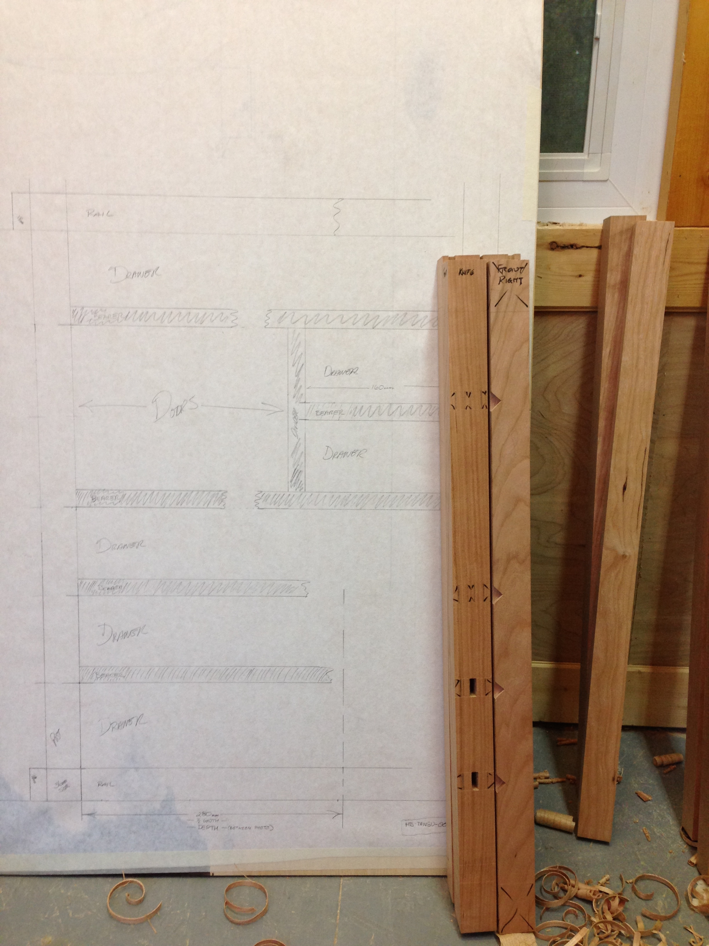 hbt2-1I find myself at the beginning of another tansu project.  This one will be slightly different from the last.  The drawer arrangement will incorporate an additional bit of joinery.  Specifically I want to add a divider to enable asymmetrical arrangements.  One of the hallmarks for Japanese tansu an asymmetrical arrangement of the drawers and doors and I want to be able to emulate this feature in my designs.  I think I have this new joinery element figured out but I want to get the frames and bearers dry fitted before I commit to cutting anything for the divider.