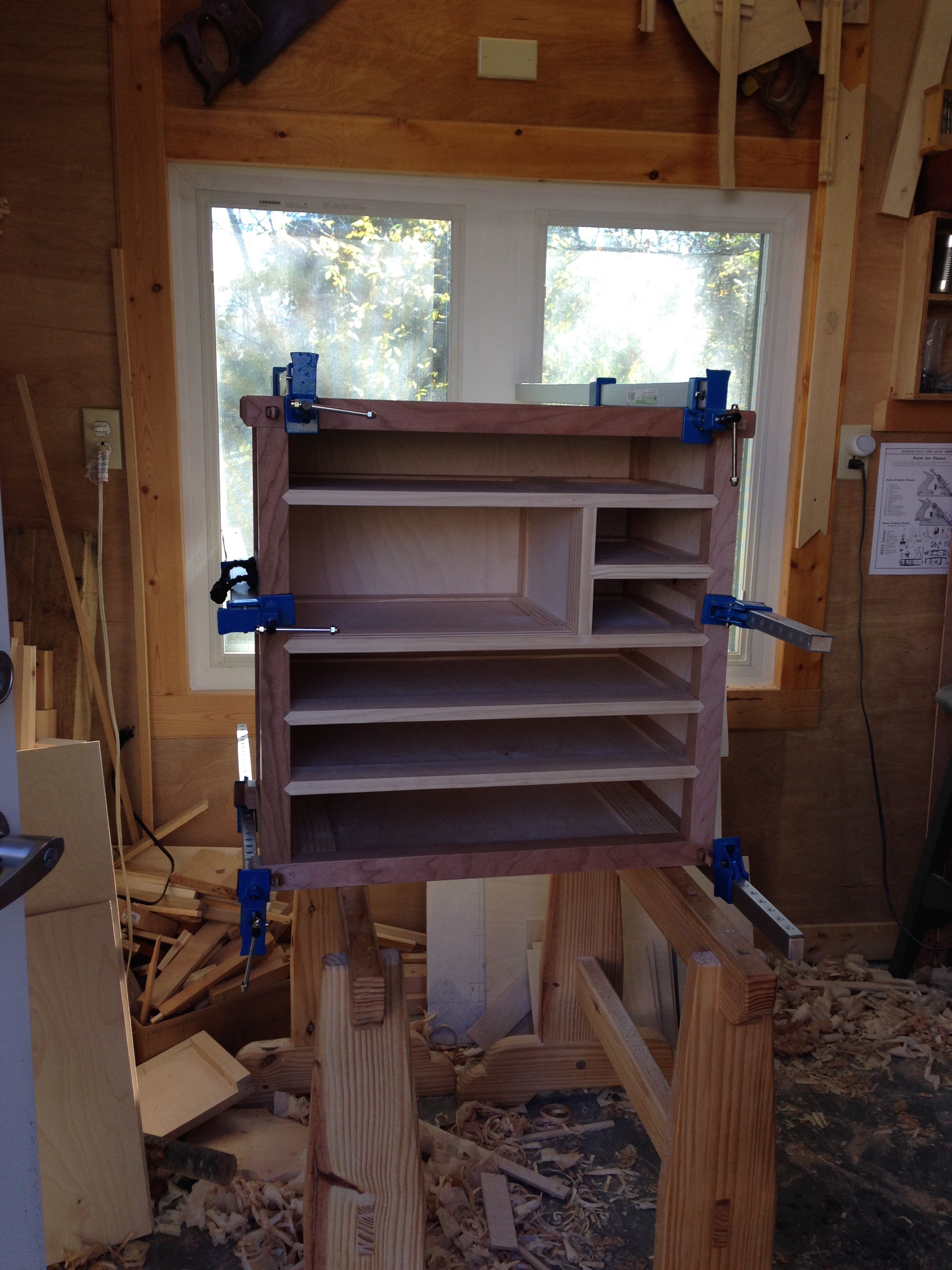In reality, I could skip the glue and simply clamp the carcass tight, drive in the wedges and the assembly would be just fine. The glue is not needed to hold the thing together, but I still feel better knowing it’s there. Maybe on the next build I will be brave enough to skip the glue….maybe?