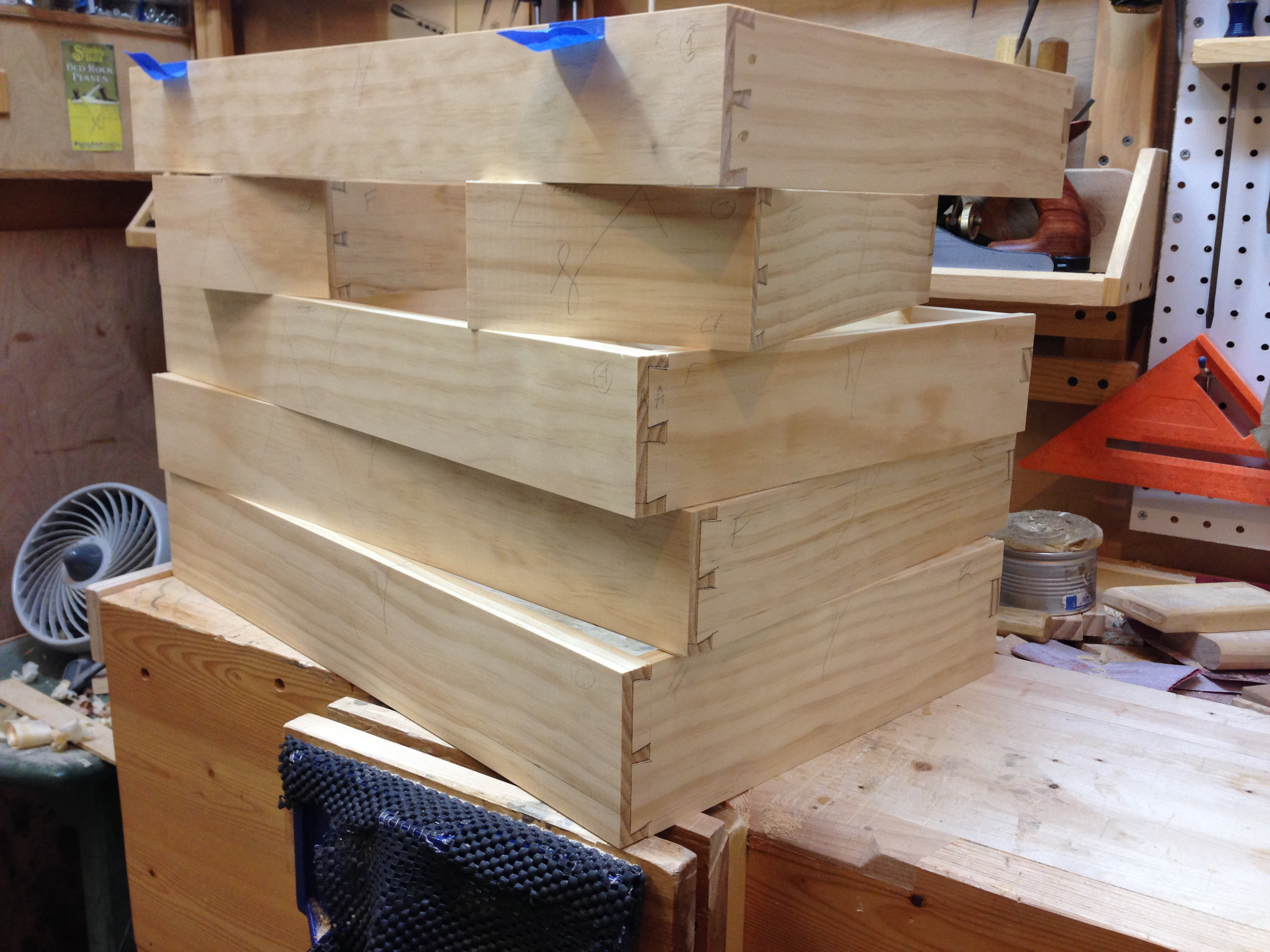 I only managed to get about an hour in the shop over the past week. So my goal this morning was to complete all of the drawer frames and have them glued up. It’s now 8pm and I had to call it a day. I met 50% of my goal. All of the drawer frames are made and will have to wait until tomorrow for glue.