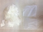 The raw silk wadding is just a bunch of fibers. These will act like a sponge to hold the ink in the sumi pot. The packaging and directions are in Japanese only but there is a drawing that gives you the setup. There are two small micro mesh bags included in the box. The silk is to be divided and stuffed into these bags. If I was setting up a traditional sumitsubo with an ink line, one bundle would be placed below the snap line and one on top. The idea is that as the line is drawn between the two bundles of ink soaked silk it will be completely coated. Since I’m just setting up a sumi pot I’ll only need to use one bag.