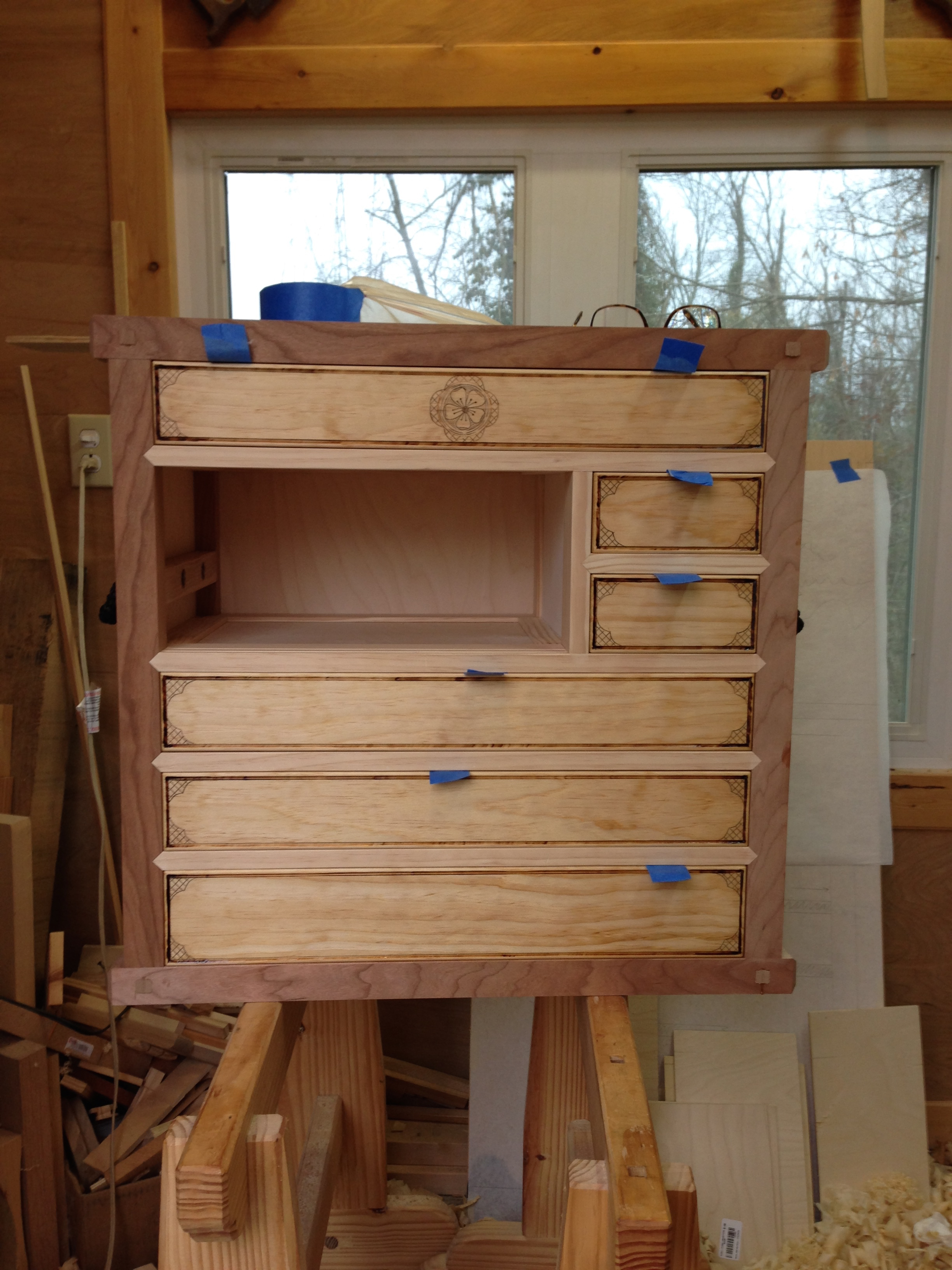 The next detail I added was some kolrosing to each corner and a center medallion on the topmost drawer.  I created a pattern to make this go a little quicker and to ensure uniformity.  I lined up the pattern on each corner and traced along it with a utility knife.  I then added some additional incised lines to complete the design.  The center medallion was created with the same pattern with the addition of a freehand cherry blossom motif.  Once all the lines were incised I rubbed instant coffee into them and used a fine grit sandpaper to remove any areas that had been raised by the knife.