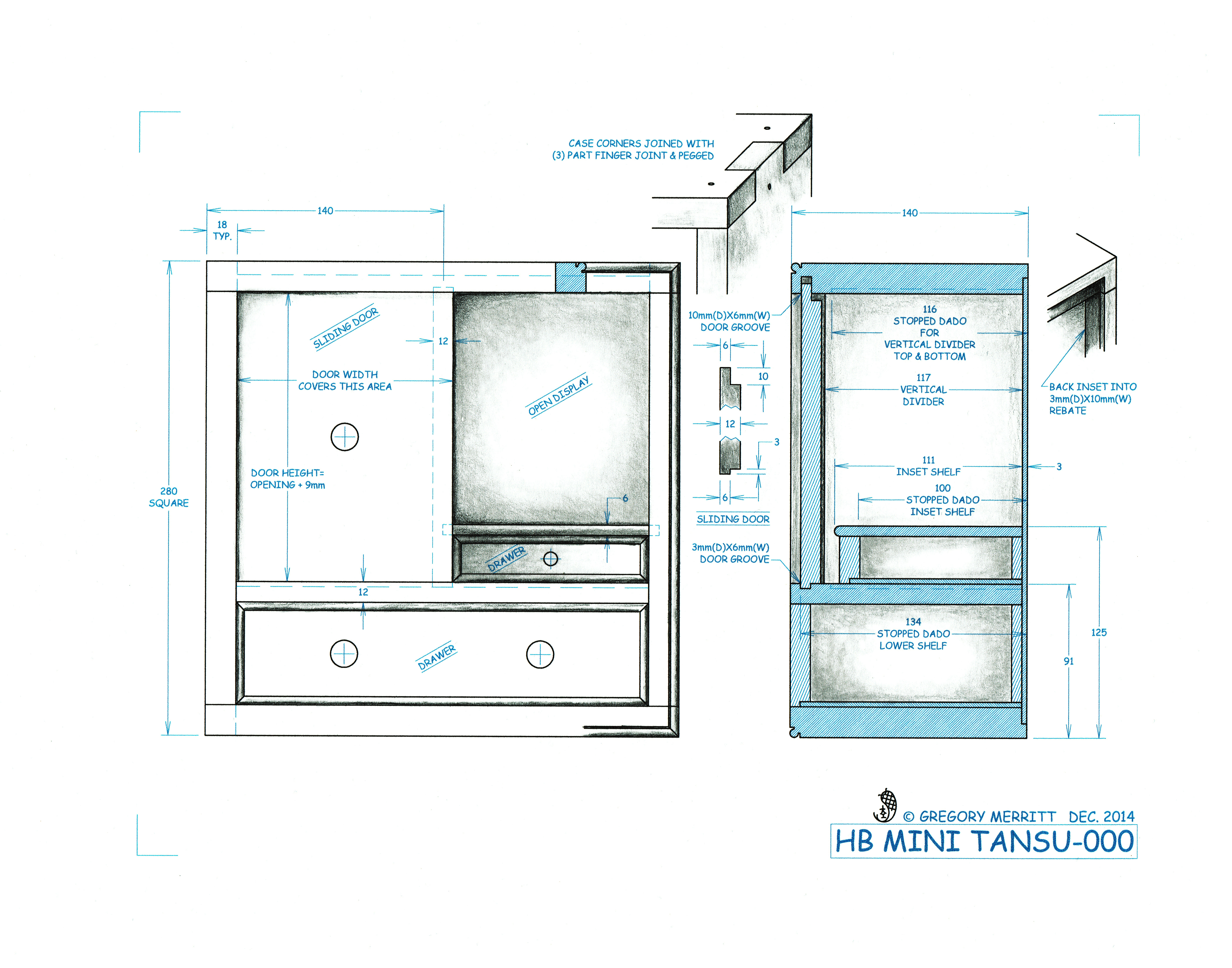 In my ongoing pursuit to develop a few key designs from which to work with, I have come up with this little cabinet. Which continues my tansu theme. Being that this is a basic square there are several configuration possibilities. I could easily make this larger or smaller. There could be multiple drawers or no drawers at all. This first version will have one full-width drawer across the bottom. A small inset drawer with an open display shelf above and a single sliding door that will cover a storage area. The divider is placed directly in the center giving the option of using either side as the open display area. I wanted this cabinet to have several layers. The only parts that sit flush with each other is the outer frame, horizontal divider and bottom drawer. All of the other parts sit at a different level.