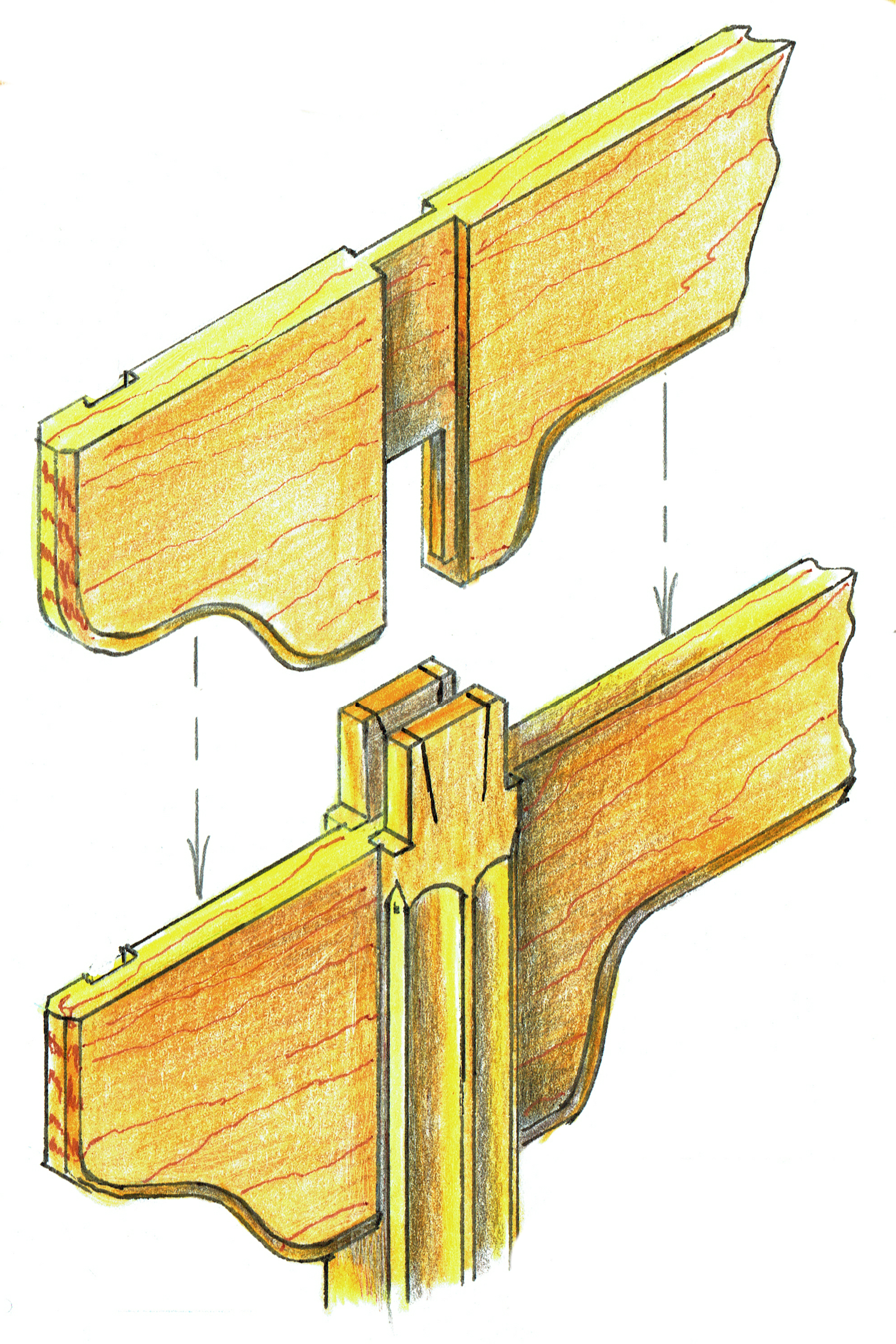 cgb-saddle_view-dwgThe second item I want to discuss is the joinery for attaching the long rails to the leg assemblies.  Again I found two primary methods.  One method had this rail constructed from a single wide board.  The other utilized separate boards for the lower decorative gussets and then another board for the upper structural element.  To the best of my knowledge the original antiques utilized a saddle joint for attaching this long rail to the leg assemblies.  While it may appear complex, it is actually quite simple to execute.  So why go to the trouble of this arrangement?  Strength, a lot of strength.  The four shoulders of each saddle joint provide support to each leg helping it to resist racking forces from either side.  Essentially gusseting the top third of either side of each leg.