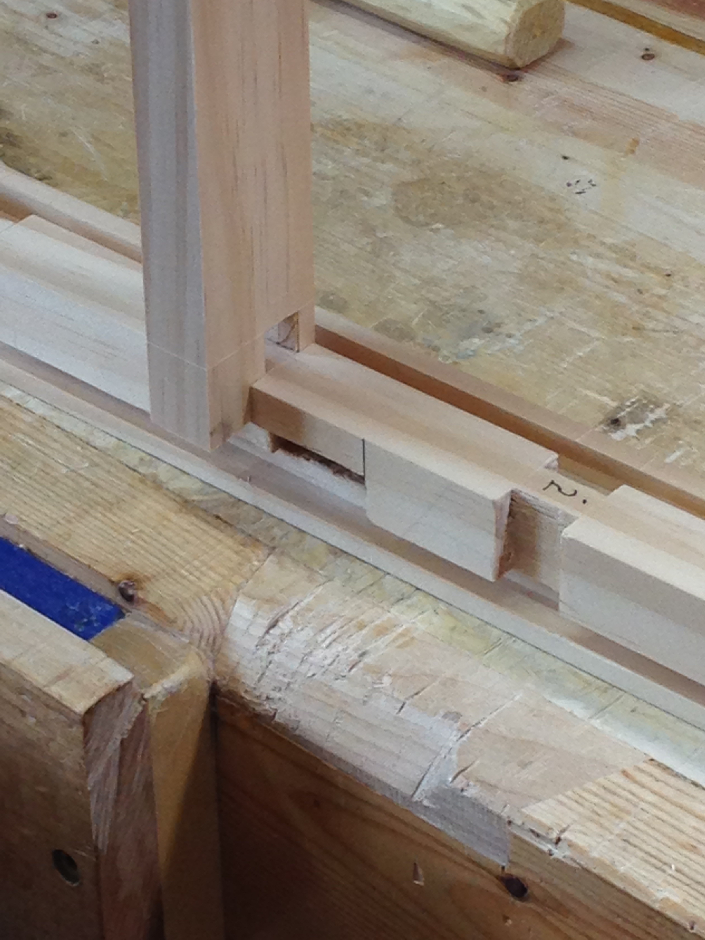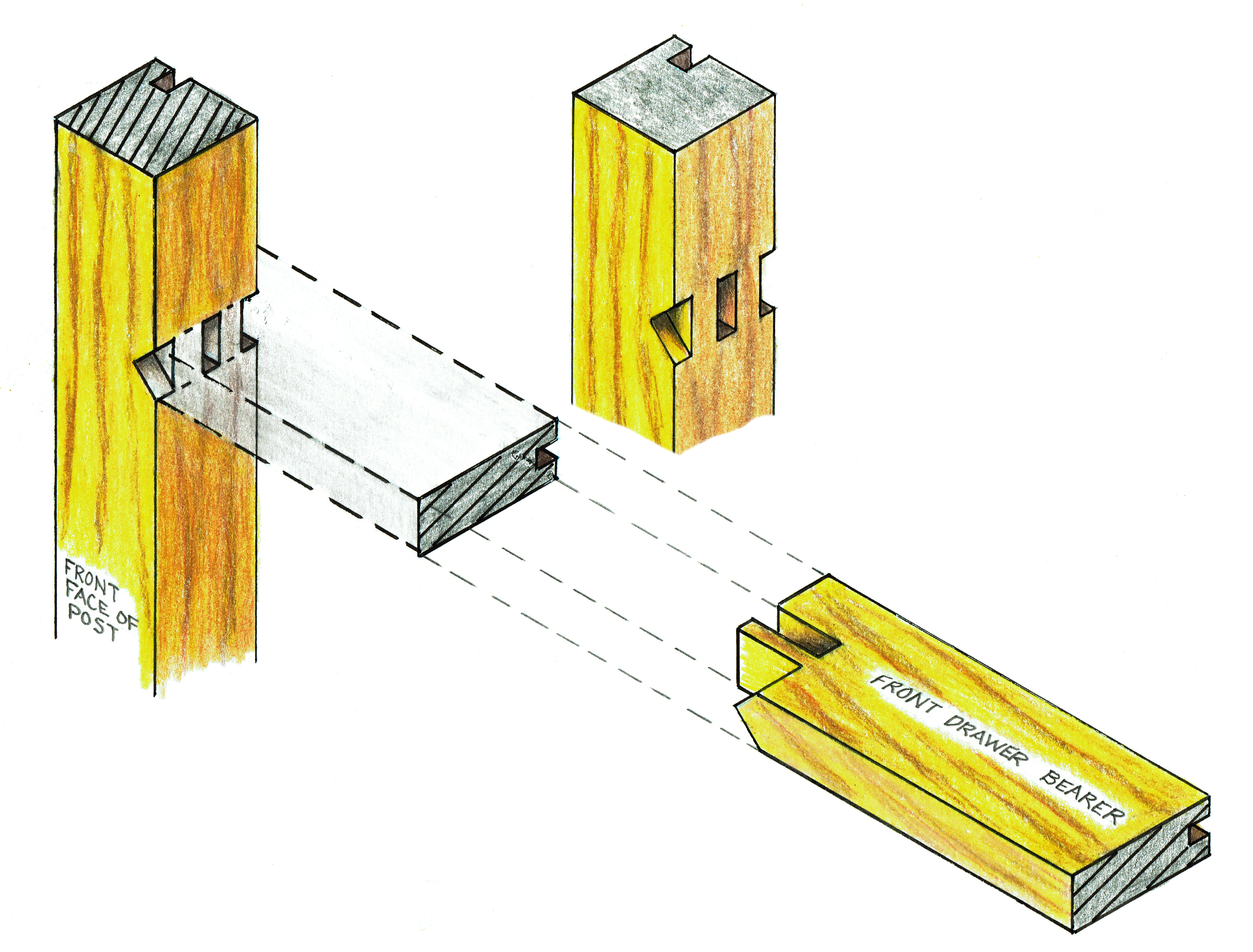 I began with the joinery for the rear bearers. The joinery for these is a little simpler and gave me a chance to warm up. The joint is a modified saddle joint. By adding the housed portion to the mortise and tenon, a great deal more rigidity is achieved. It also creates additional support for the drawer as well as ensuring the post is held square.