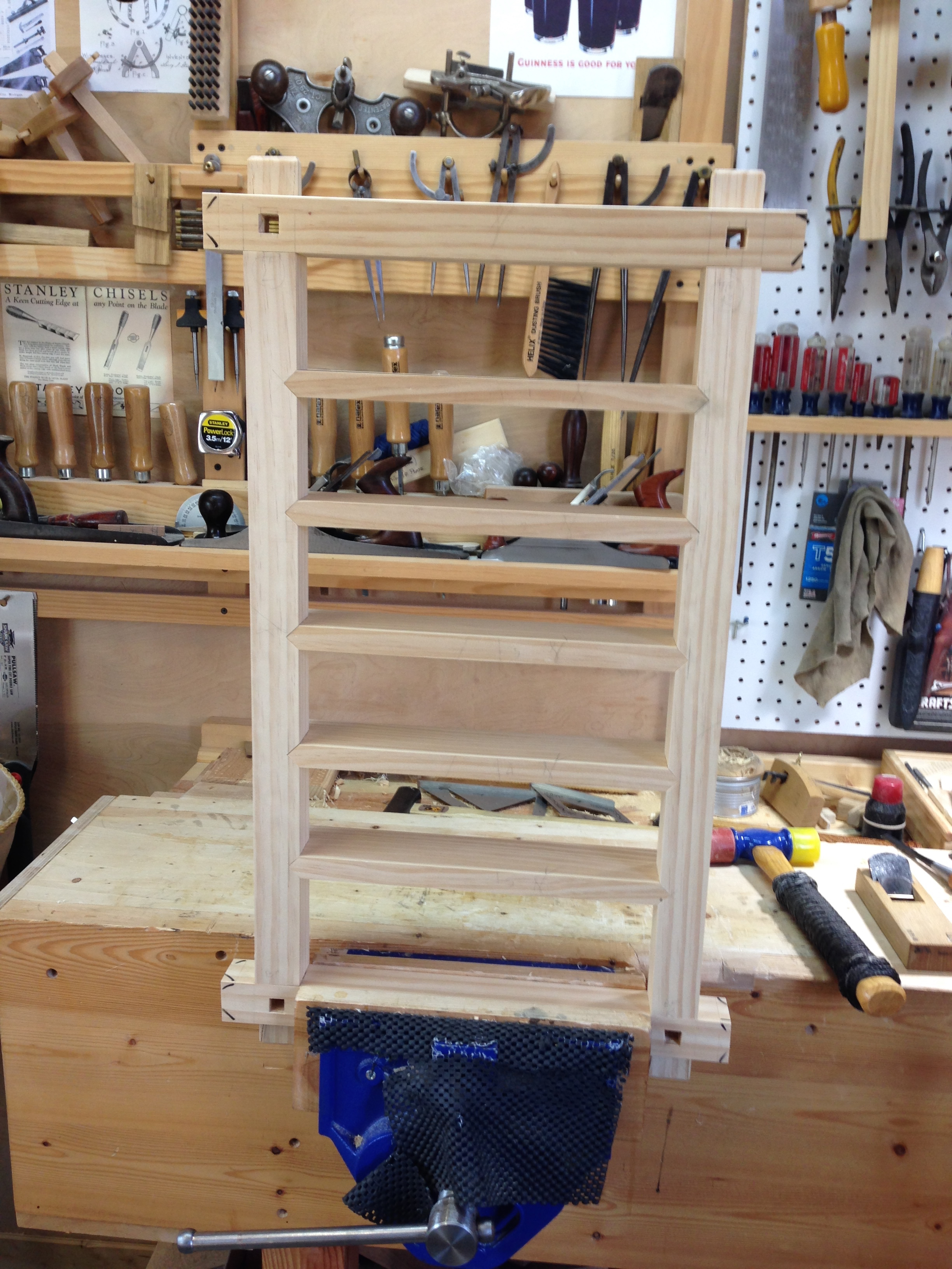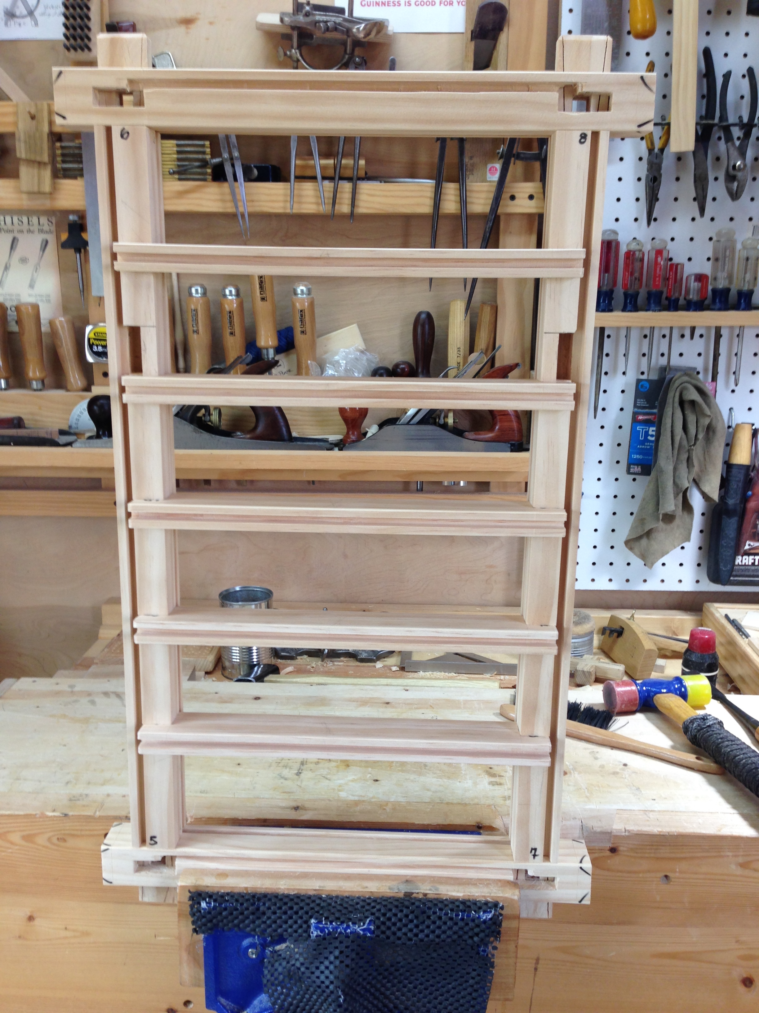 A dry fit of the front frame assembly. I still need to fiddle with a couple of the bird’s beak joints. Clamp pressure draws all of them tight, but I feel better about it if the set tight without the need of clamp pressure. Maybe I’ll make that paring guide before I tackle the final fitting.