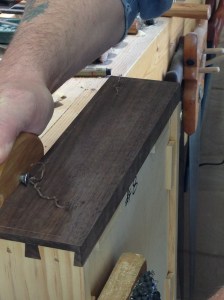 The first decorative element I added to the drawer fronts was a perimeter bead.  Pretty simple to do.  The inner portion of the bead is formed with a flat head screw installed in a block of wood.  The remainder of the bead is formed with a plane and a little sanding.  That’s the long grain beads.  The end grain bead requires a little more effort, but not much.  The screw is used as a gauge, then the inner wall is knifed in.  A chisel is then used to remove the waste to form the inner portion of the bead.  The outer portion of the bead is completed in just the same manner as with the long grain.
