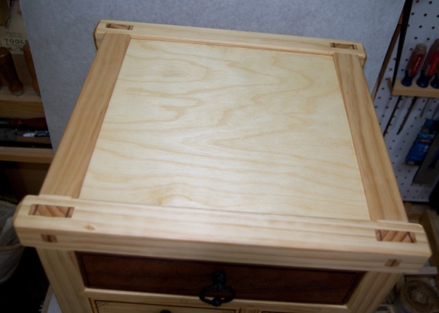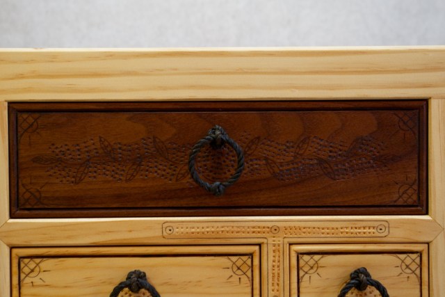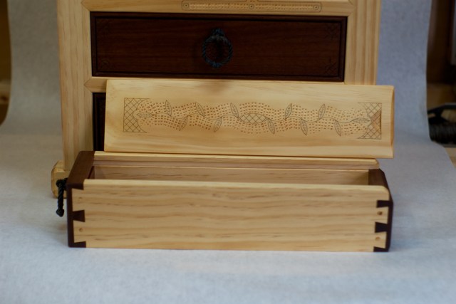 Another challenge the walnut presented was with the decorative elements.  I knew that my Hillbilly Inlay would not show up very well on the walnut and thus would be very subtle.  So I needed to keep the pattern for the inlay work subdued so the it would not become overpowering on the pine drawer fronts.  The wood burning shadow line detail that I added to the perimeter bead worked out well in both the walnut and the pine.