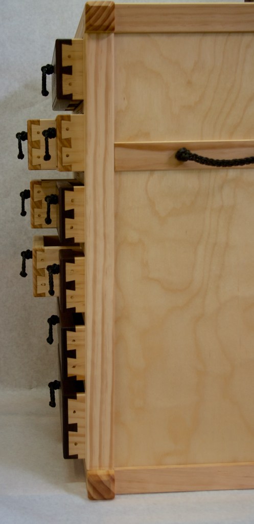 hbt2-46In a previous tansu I used cherry for the outer frame with pine and birch for the remainder.  These woods compliment each other with red and orange tones throughout.  The walnut with the pine and birch however, would quite literally create a contrast of black and white.  Although there is a slight orange undertone.  This meant that placement of the walnut and thus pattern would be of paramount importance.  There were several approaches that I could have taken.  I could have simply grouped the walnut together and created a block of walnut and pine drawers.  I don’t believe that would have created much visual interest though.  What I chose to do was two-fold.  I used the walnut to anchor the drawer bank at both the top and the bottom.  I used two walnut drawers at the bottom to add visual weight to the piece.  The remaining walnut drawers were arranged to strengthen the asymmetric pattern of the remaining drawers.   The entire look of the tansu would be different if I had chosen a different arrangement.