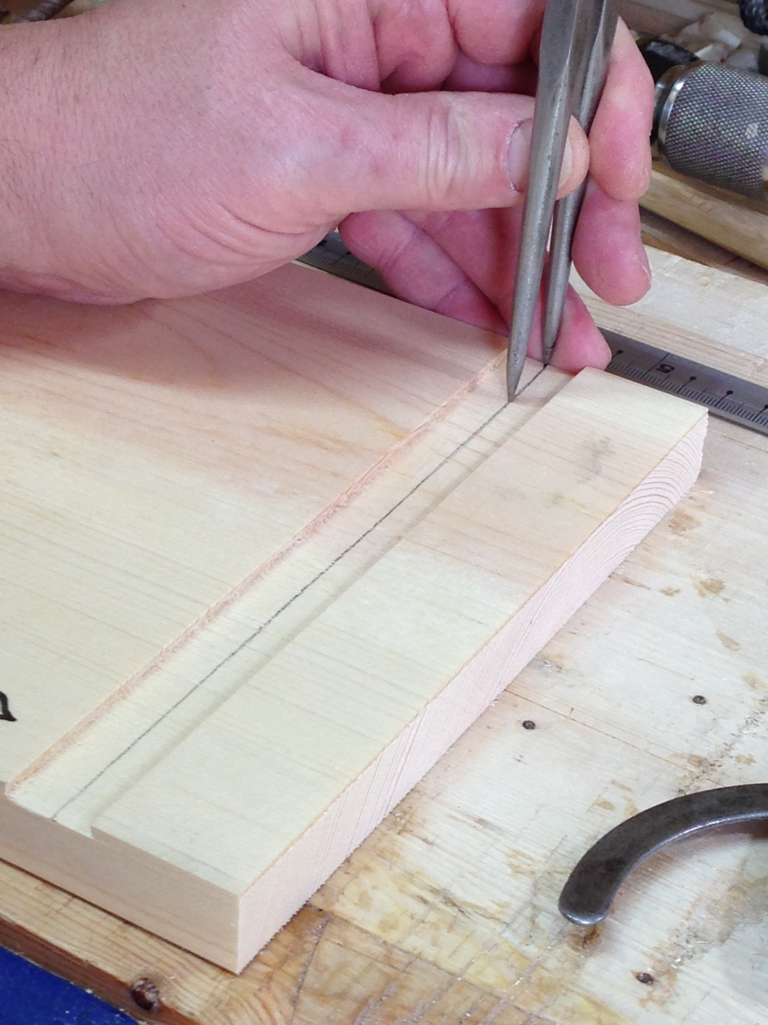 Draw a center line and set out the offset from the edge with narrower pair of dividers.