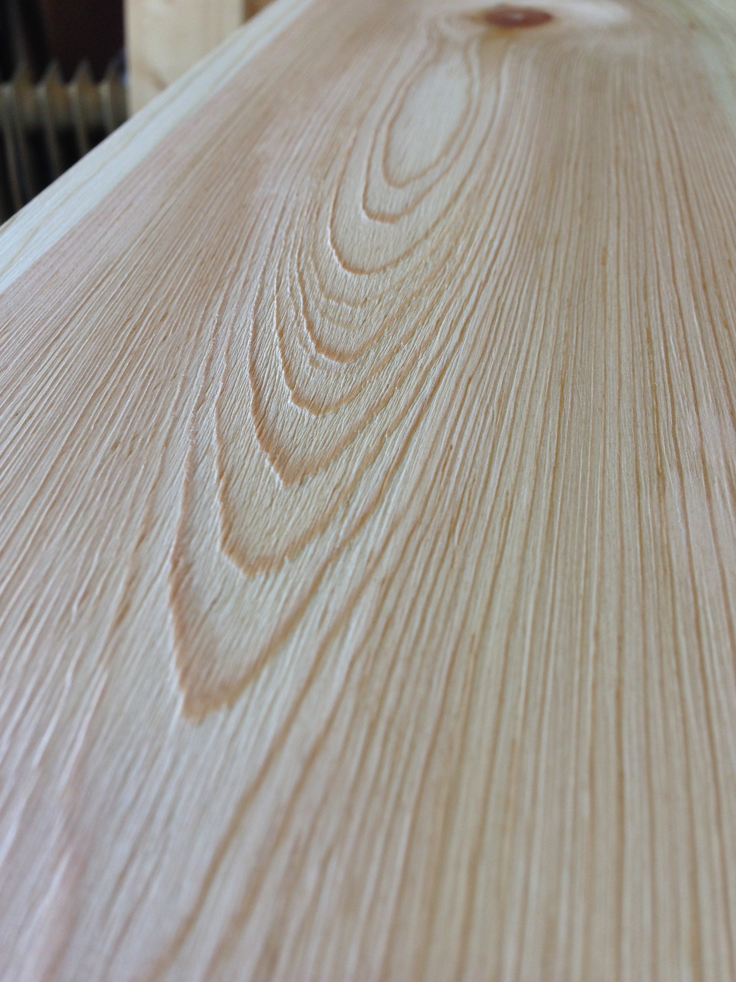 Another trick, I learned strictly by happenstance. It’s been abnormally hot the last few days. 90F hot. So while working on one of the sides some sweat dripped onto the work piece. The wetted area reacted very differently than the dry area. The wet area caused the uzukuri to be far more aggressive in the soft early wood. So a little experimenting and I discovered that by wetting the wood I could remove the early wood to a greater depth without any significant change to the harder late wood. The result is a much more defined grain pattern. The downside is that I’ll need to let the wetted areas dry for a day or so before continuing with the “medium” and “fine” uzukuri. You can’t burnish wet wood. The photo below shows the result of wetting and the “rough” uzukuri.