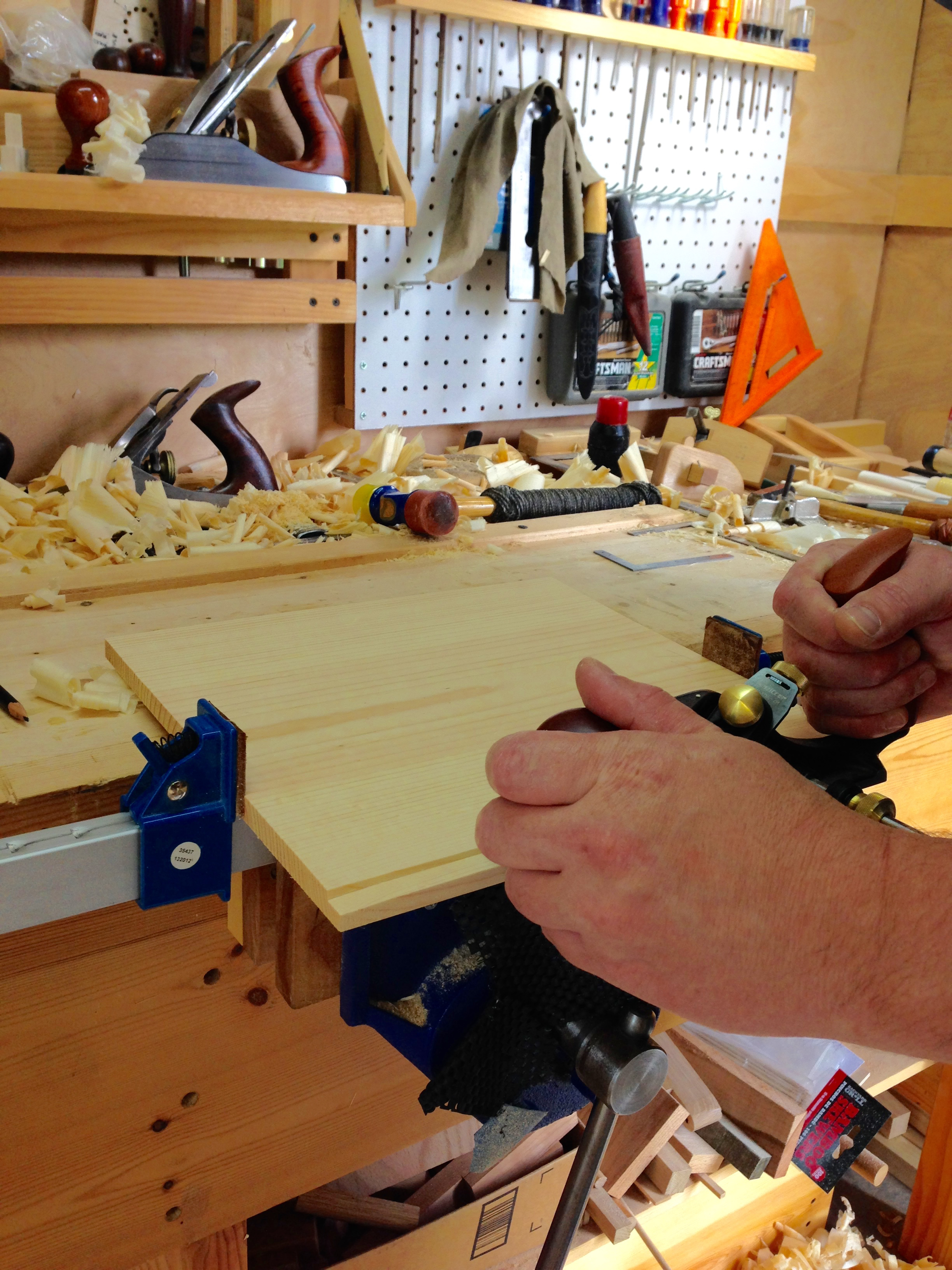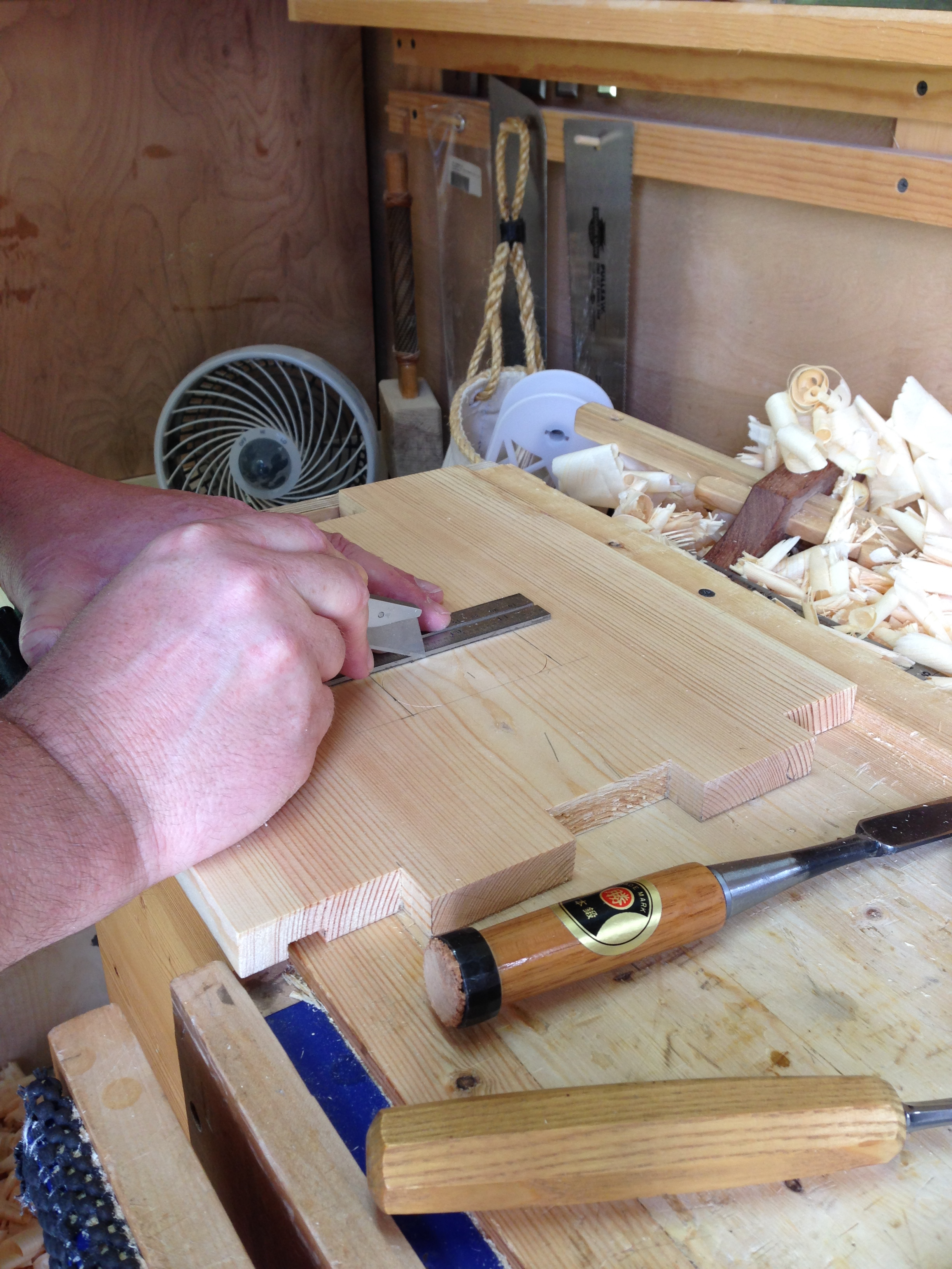 Looking great! I’ve had the same niggling troubles with squareness because of dadoes not being the same depth, or possibly the wood is softer on one component or maybe I’m applying uneven clamping pressure while trying to correct a bow. I’m about to start a couple more Japanese tool chests and will be rebating my end boards to fit into narrower dadoes. My hope is that the shoulders of the end boards will register solidly against the finished surfaces of the sides, allowing for some sloppiness in the dado. Getting accurately square rebates on the end boards should be easy because I’ll be ganging them up and creating my rebates directly from the scribe lines.