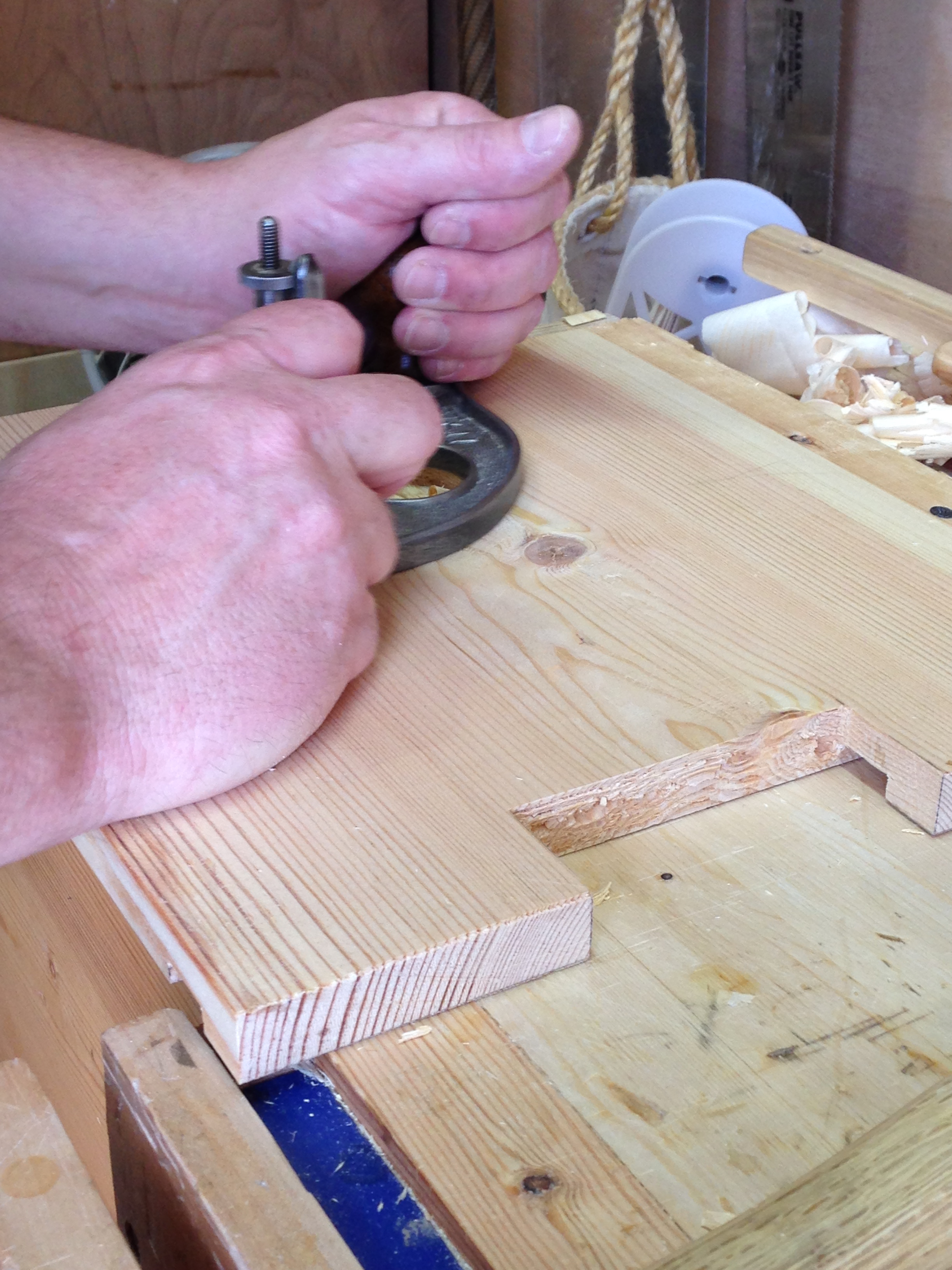 The top edge of the back panels were run thru the shooting board and then trimmed for height.  I decided to use a simple shiplap joint were the two panels meet each other and the rebate plane made quick work of this.
