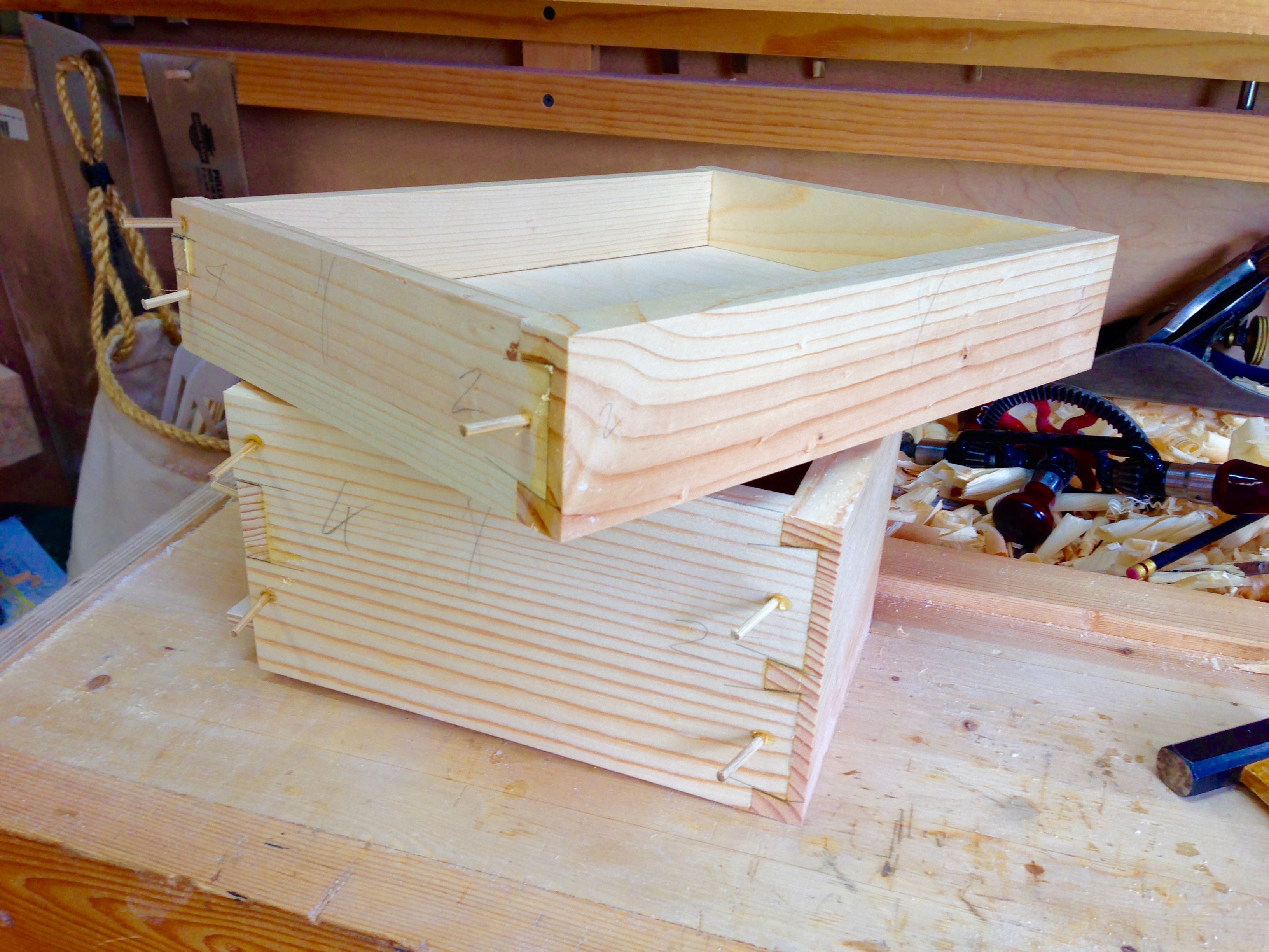 Nothing new as far as the construction. Pegged lapped dovetails at the front and a pegged finger joint at the rear. The 6mm birch ply bottom is installed in grooves that run down the sides and across the front. It is then pegged to the rear of the drawer.
