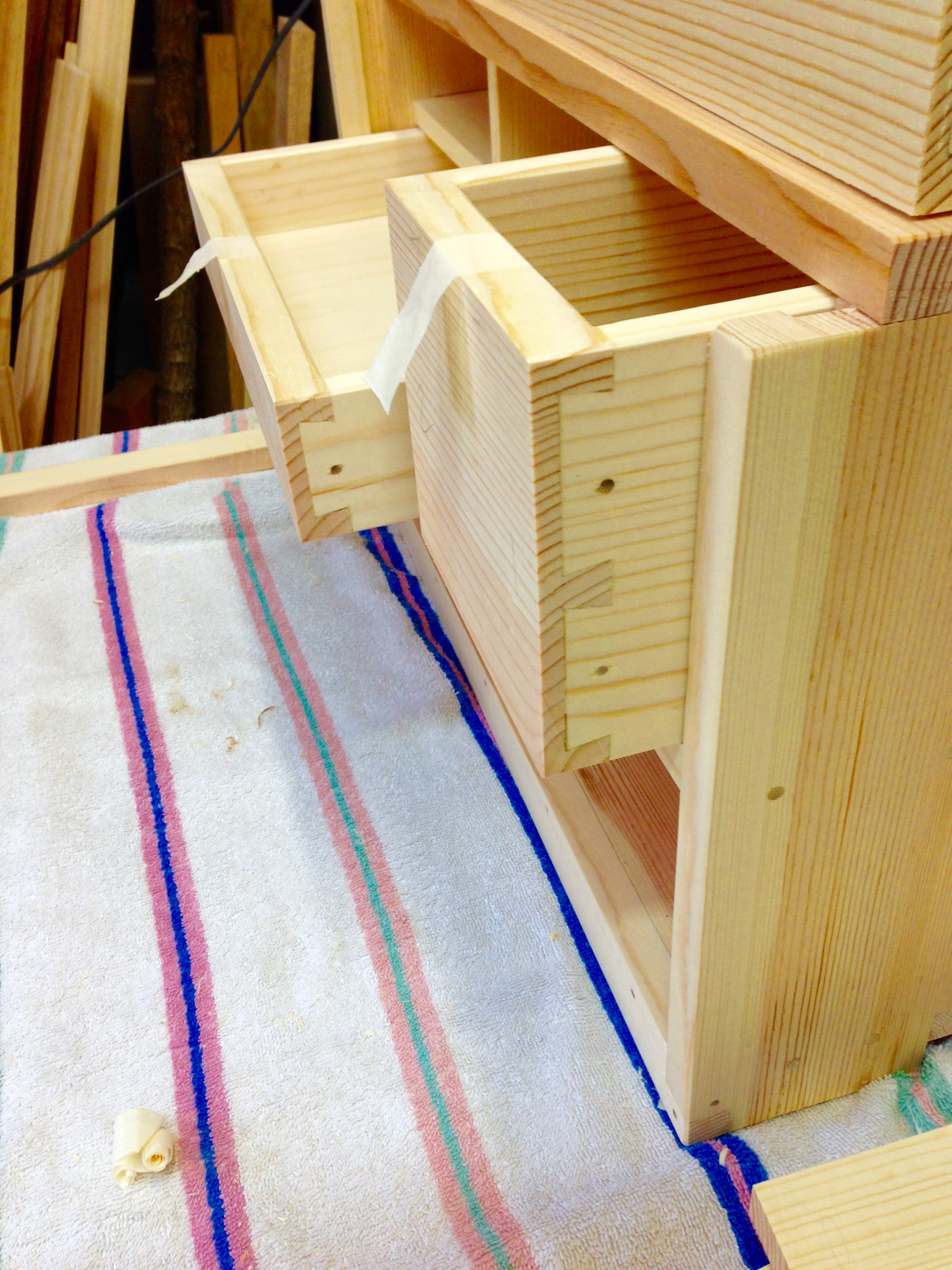 The weather here continues to be brutal. Hot and very humid. I’m starting to adjust to it though and have been able to work in the shop after work a couple of evenings over the past week. This allowed me to complete the construction of two drawers, glue them together and finally fit them.