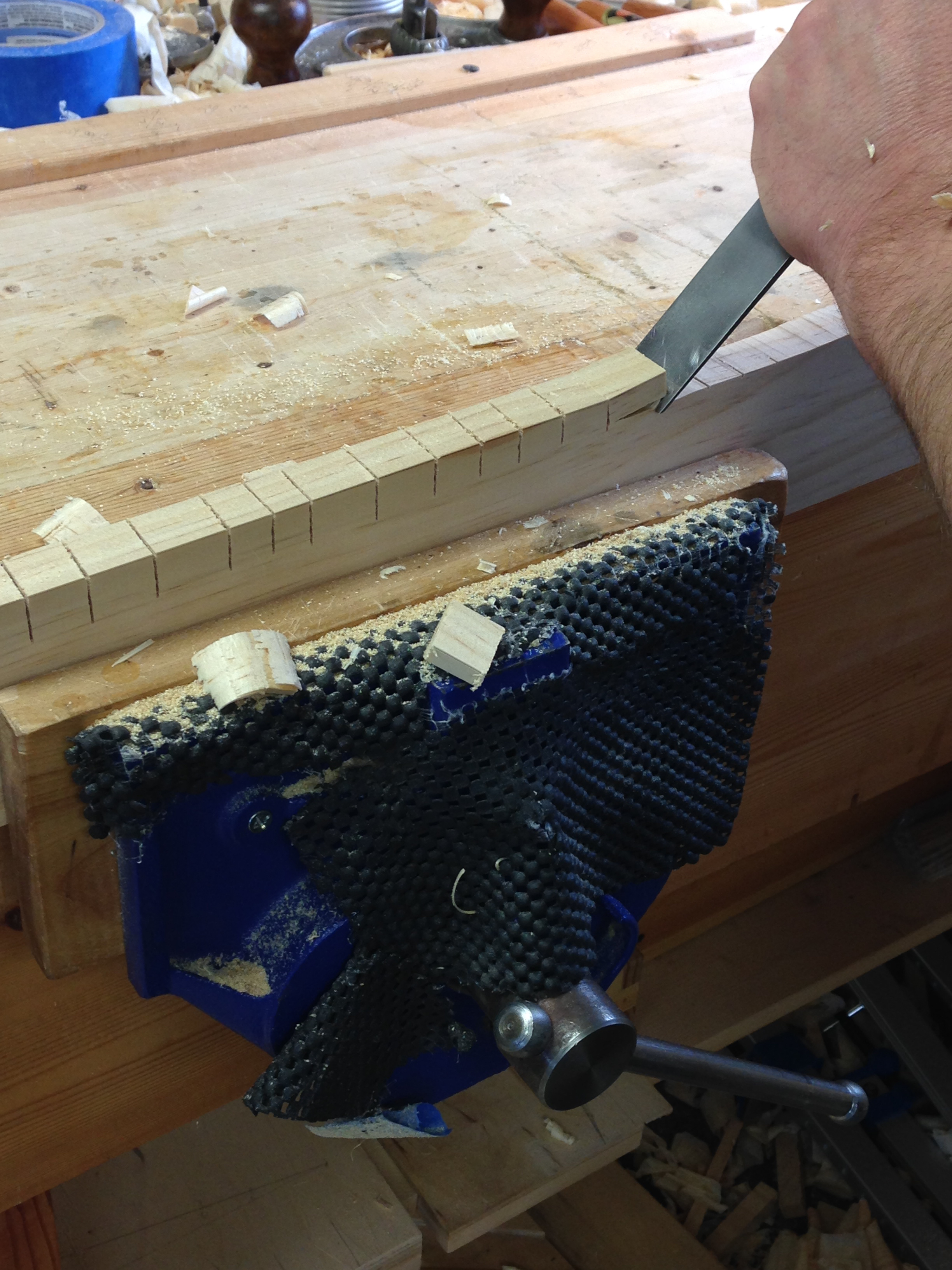 There are several ways to remove the waste wood. You could use a coping saw or a turning saw, but I opted to use stop cuts, chopping with a chisel and followed up with a spokeshave. I find this method pretty quick and somewhat therapeutic.