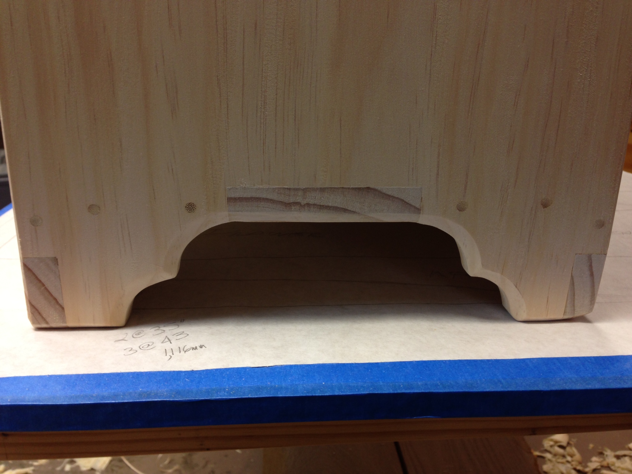 Once the case was cleaned up, it still needs a light sanding before finishing, I completed the decorative details that make up the feet on each side panel. A little rasp and file work, followed up with the gouge and finally a little sanding.
