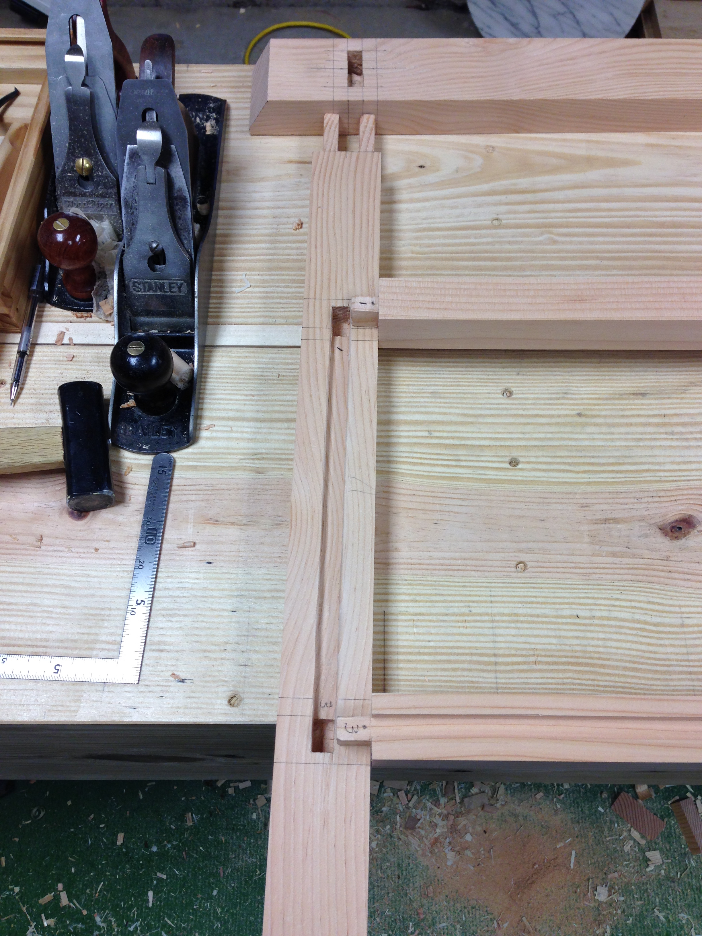 I made a start on the tsuitate screen today.  Starting with a couple of fir 2×4’s I was able to cull all of the parts that I needed and managed to avoid almost all of the knots.  If your going to use 2x construction lumber you might as well get used to the idea of incorporating the occasional knot or two.  Clear, straight-grained lumber can be boring sometimes anyway.  So embrace the knots.  🙂