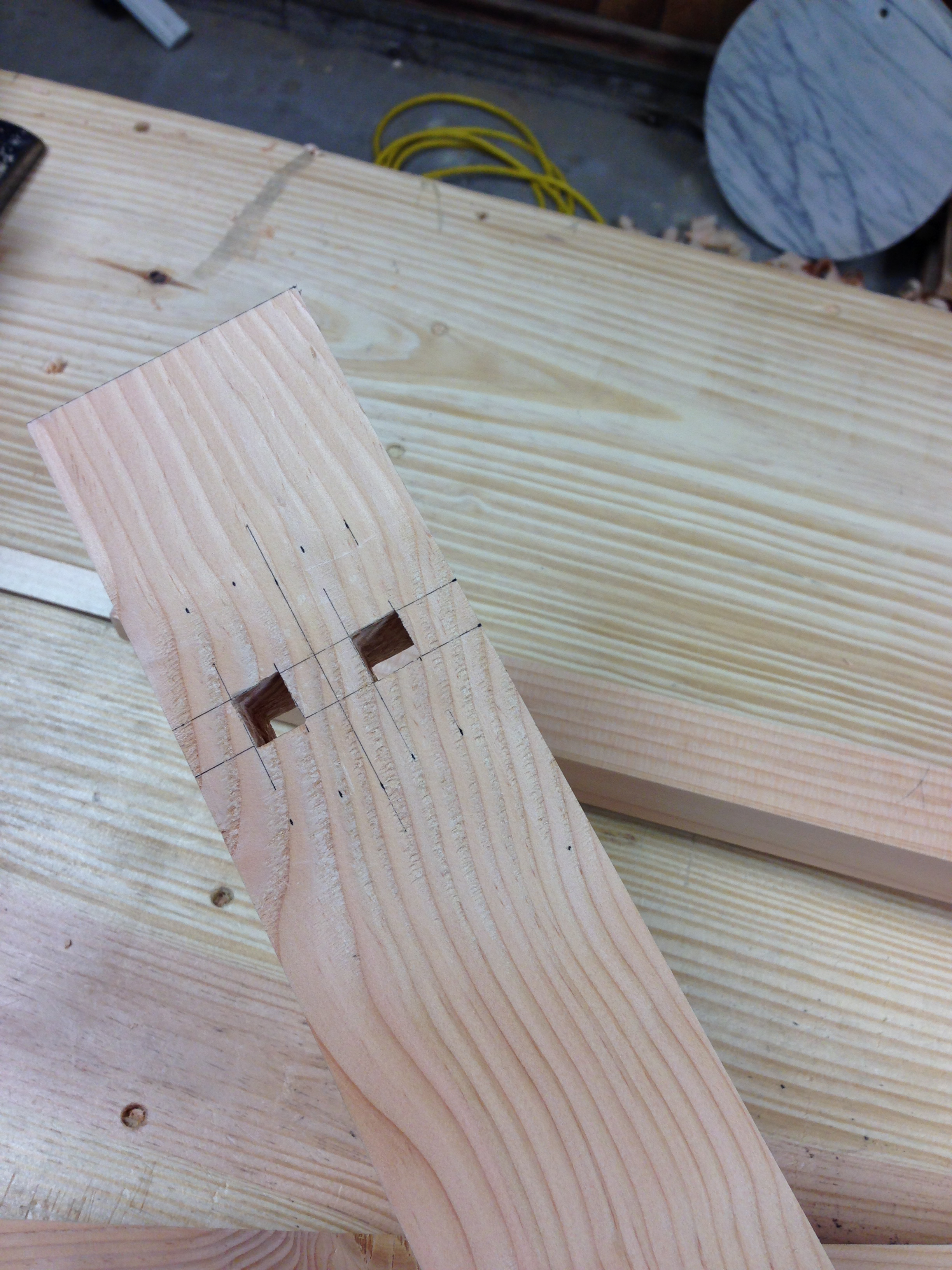 I then laid out the mortises in the top rail.  To attach the uprights to the top rail, I chose to use a stacked twin tenon.  The twin portion will make wedging simpler and should help the upright resist any rotational forces.  Nothing fancy as to execution.  Chop the smaller square portions through and then remove the section the will receive the wider base of the tenon.