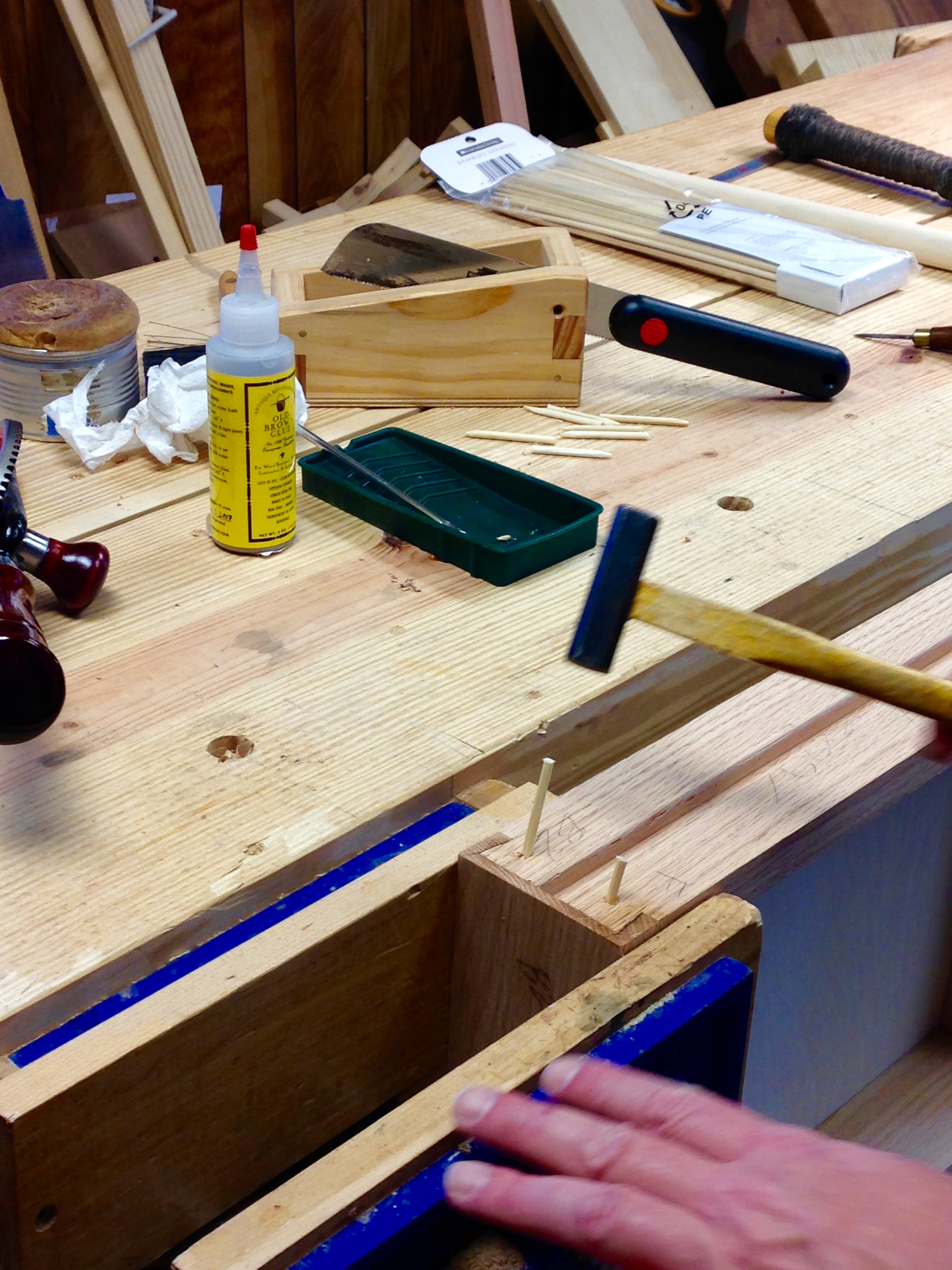 The day started easy enough.  I simply added bamboo pegs to all of the draw joints.  Yep, it is overkill, but it is how I like to put drawers together.  I doubt that I will ever have to worry about one of my drawers coming apart.  The process is simple.  Cut up a few bamboo skewers, drill a few holes, add a little glue and knock the pegs into place.  The important thing is to drive them slow.  This allows everything to adjust and lessens the chance of causing a split.  All pegs are installed and no splits.