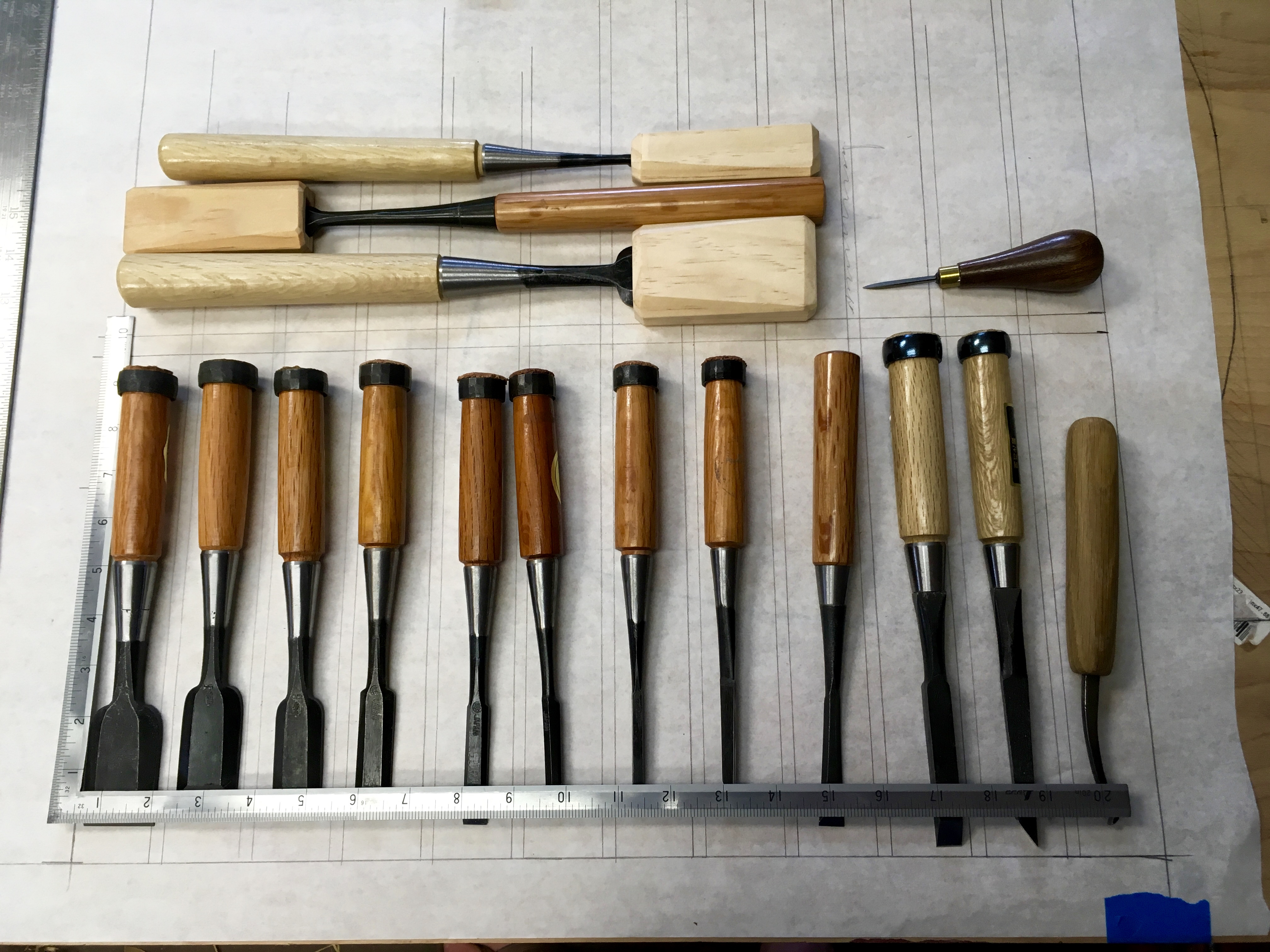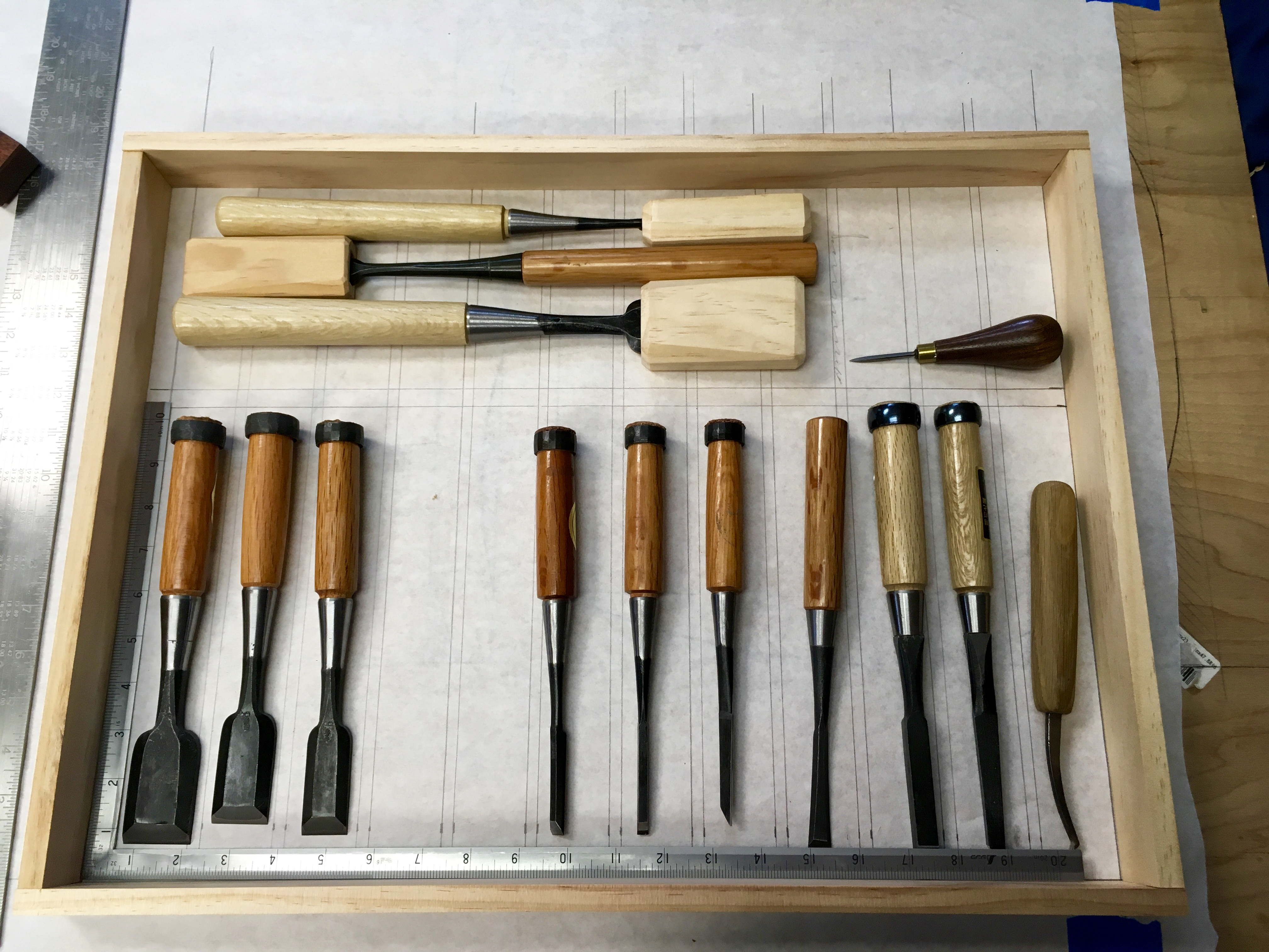 The first step was to lay out my chisels on a piece of paper to determine the best arrangement for what I had in mind. Beyond protecting my chisels, I want to be able to easily remove and replace each chisel. If I don’t satisfy that latter goal, it will be just a matter of time before I’m back to plopping chisels on the bench top.
