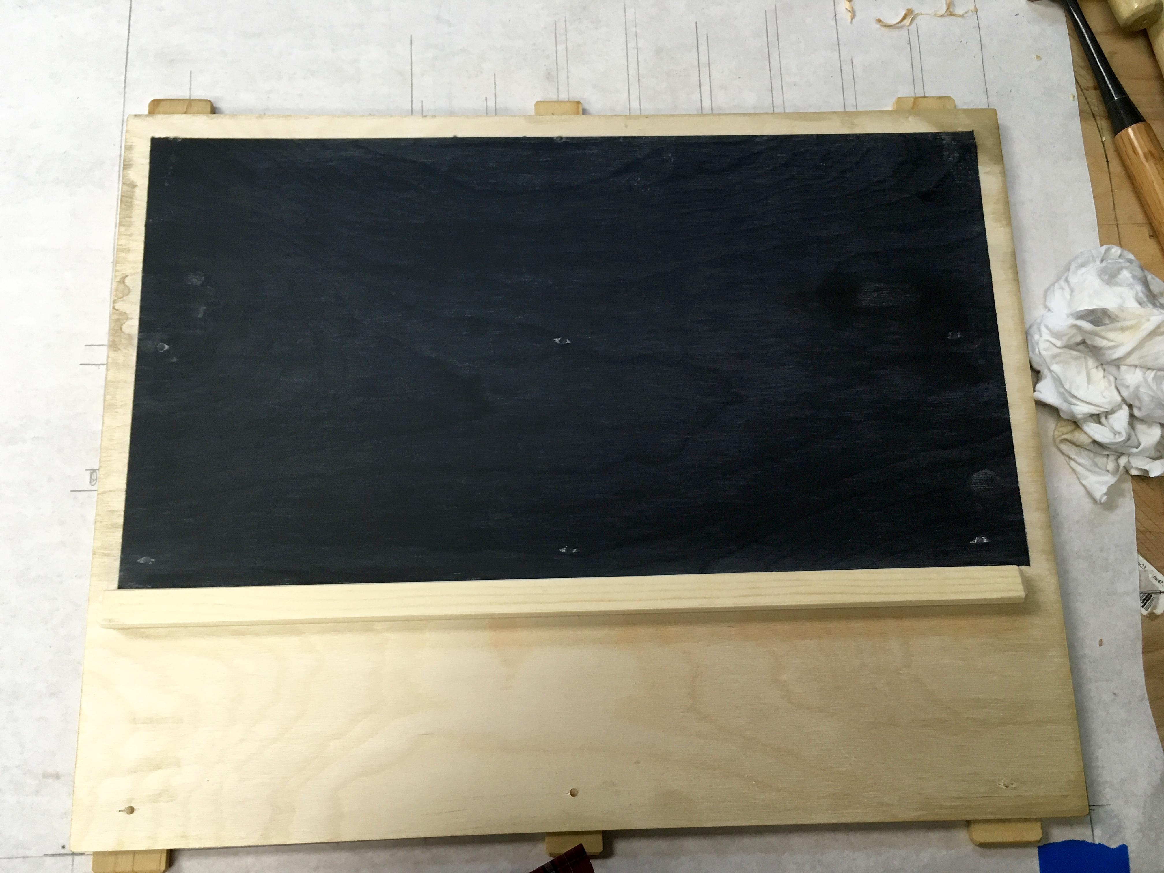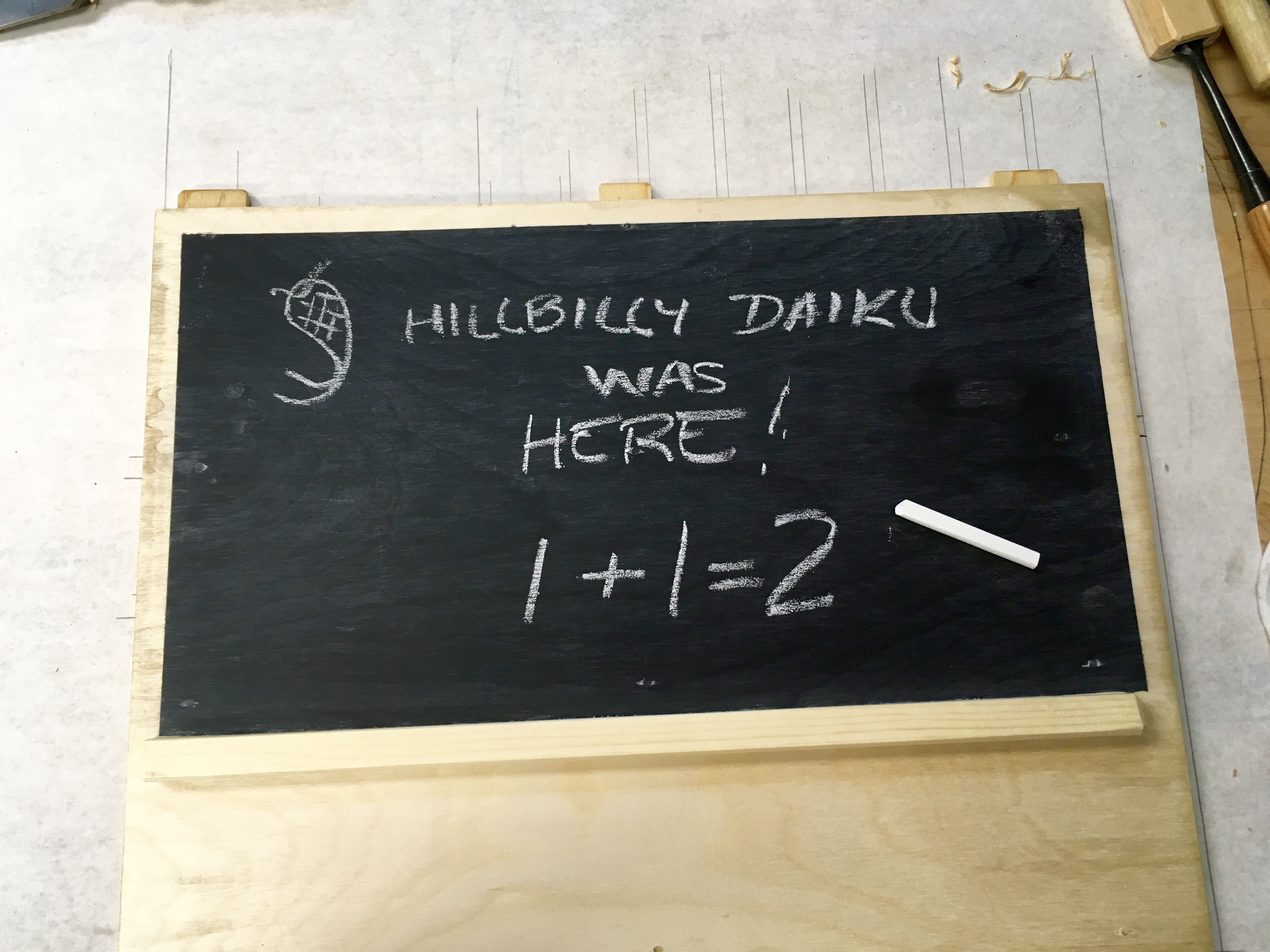 Two and a half days of 90+deg in the shop is close enough to three days cure time for me. The instructions on the can say to rub the entire surface with chalk before actually using the chalkboard. So I dutifully complied then erased it with a rag…