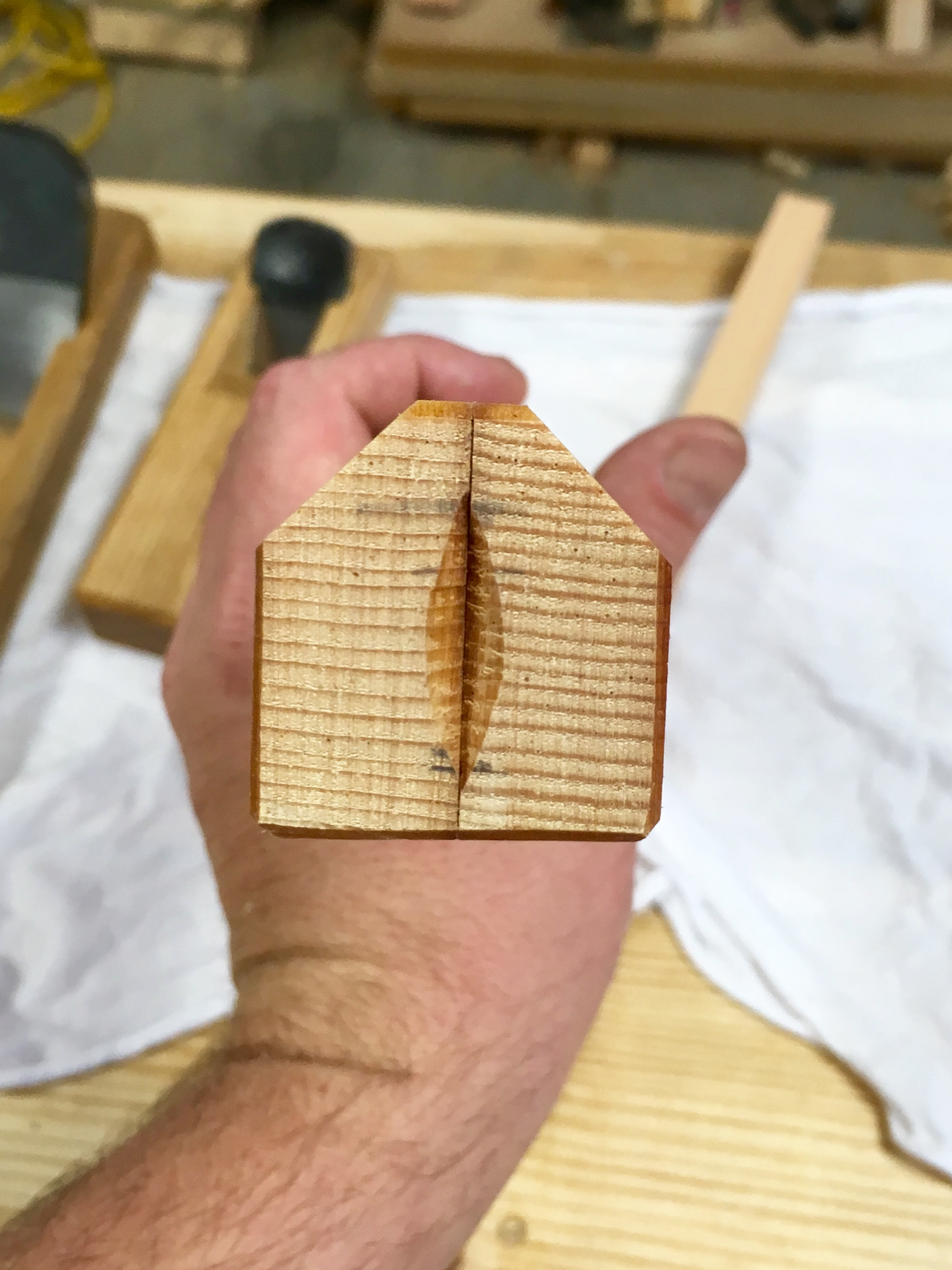 I then used the newly minted plane sole ruler to condition the sole of my newly minted block plane.  How’s that for self sufficiency?  Like with my previous plane, I bedded the blade of the block plane at 45deg.  Works great for planing the scraps of 2×4 and SYP that I’ve been running tests on.