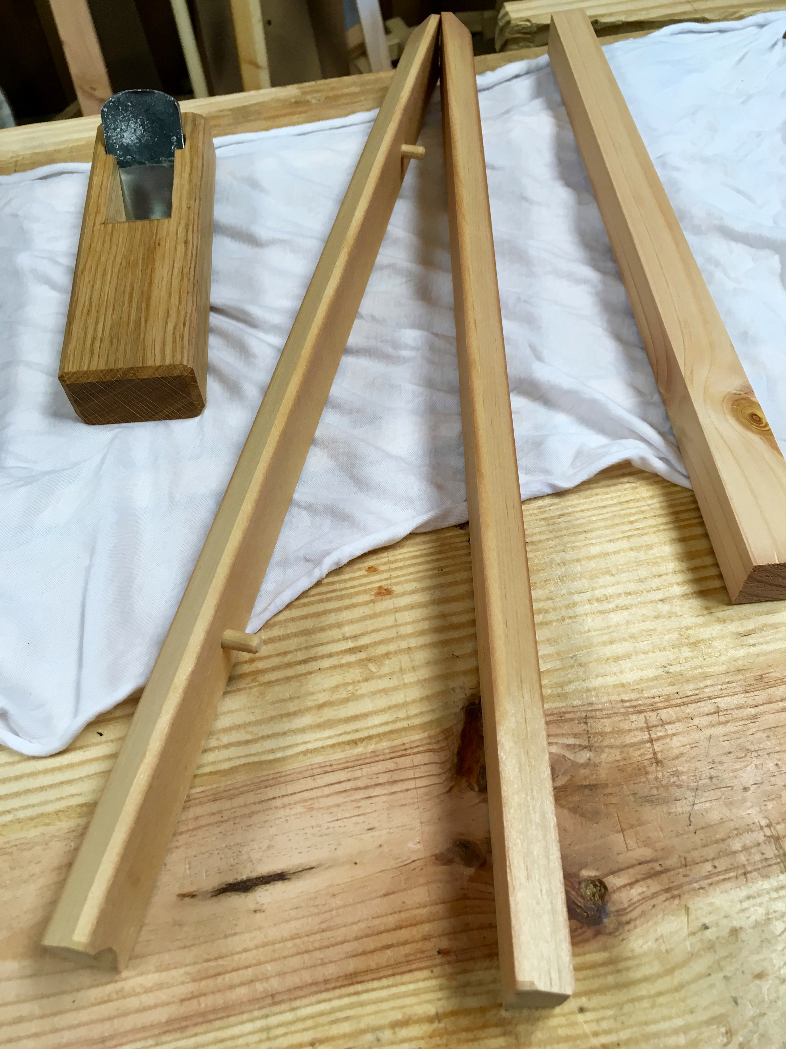 Ideally you need dry, stable wood for making the plane sole ruler.  So up into the magic attic I went and descended a few minutes later with a 3″ wide piece of straight-grained pine.  I then dressed and divided the board.  Drilled for dowel pins, they are glued into one piece and friction fit into the other.  Then I beveled the top edges and began the truing process.  Simple and cheap.