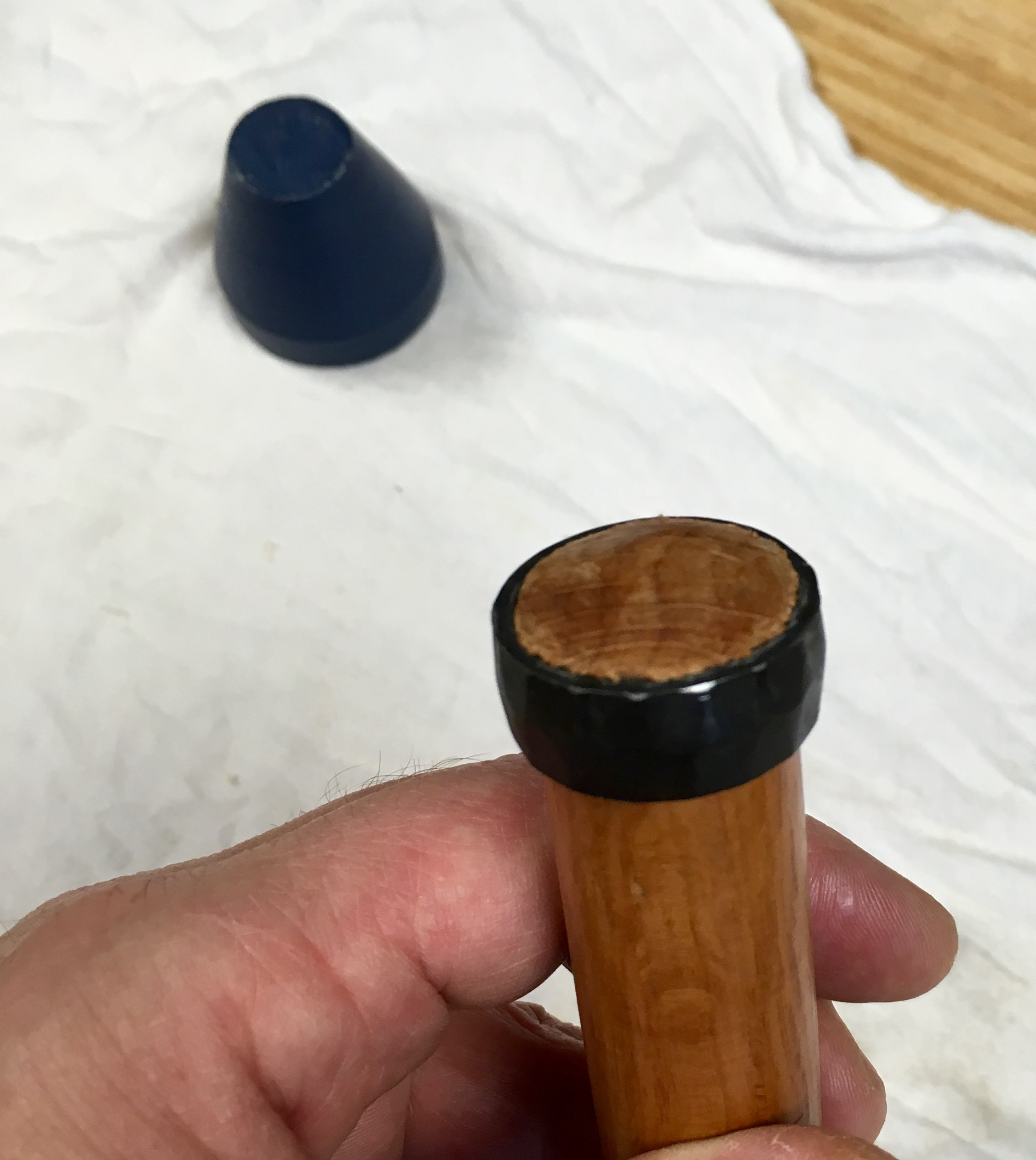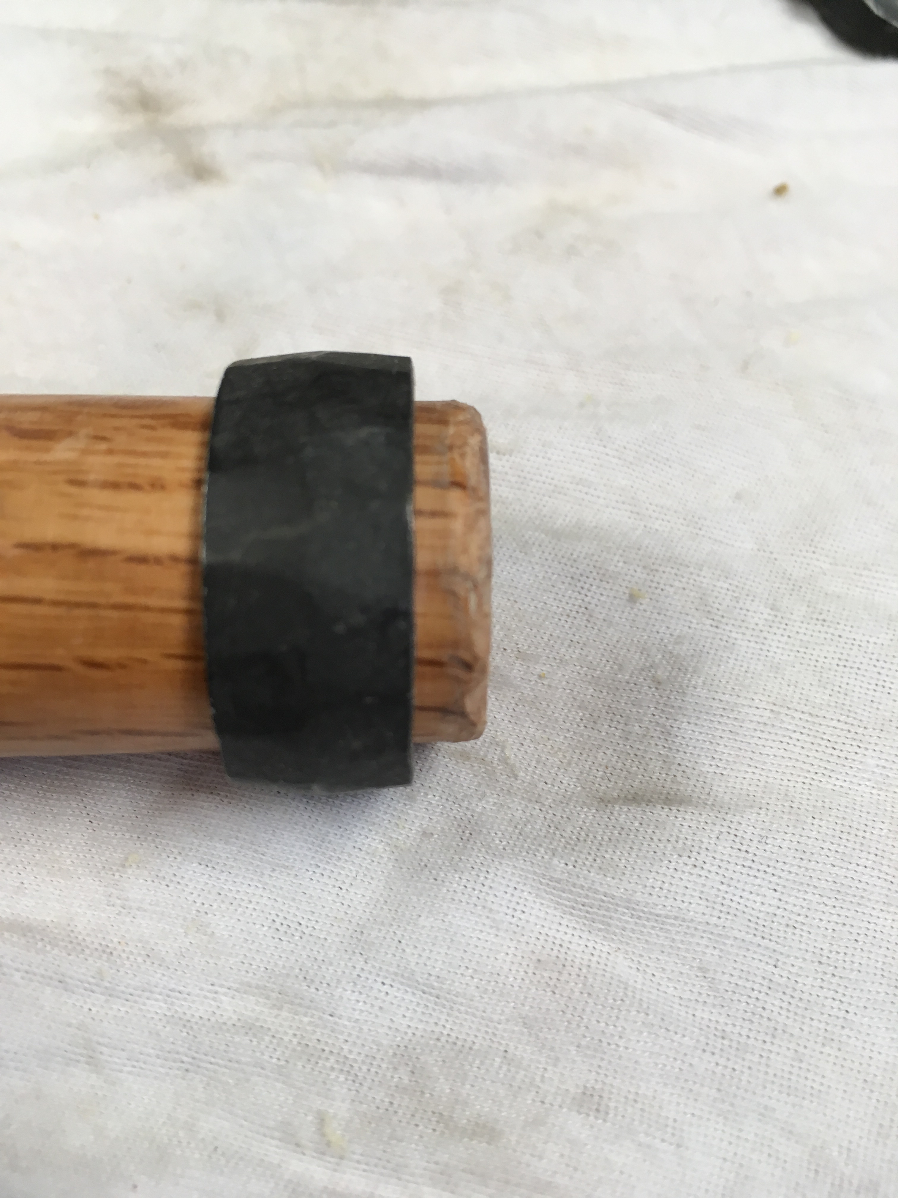Sorry that I was unclear on that point Matt. The wooden handles have a very slight taper. The hoop setting tool (the cone shaped thing in one of the photos above) does nothing more than distribute even pressure as I drive the hoop down onto the handle. I had to drive the hoop down about and additional 1/4″ before it was tight. That’s why I had to cut some of the handle end off before mushrooming the end.