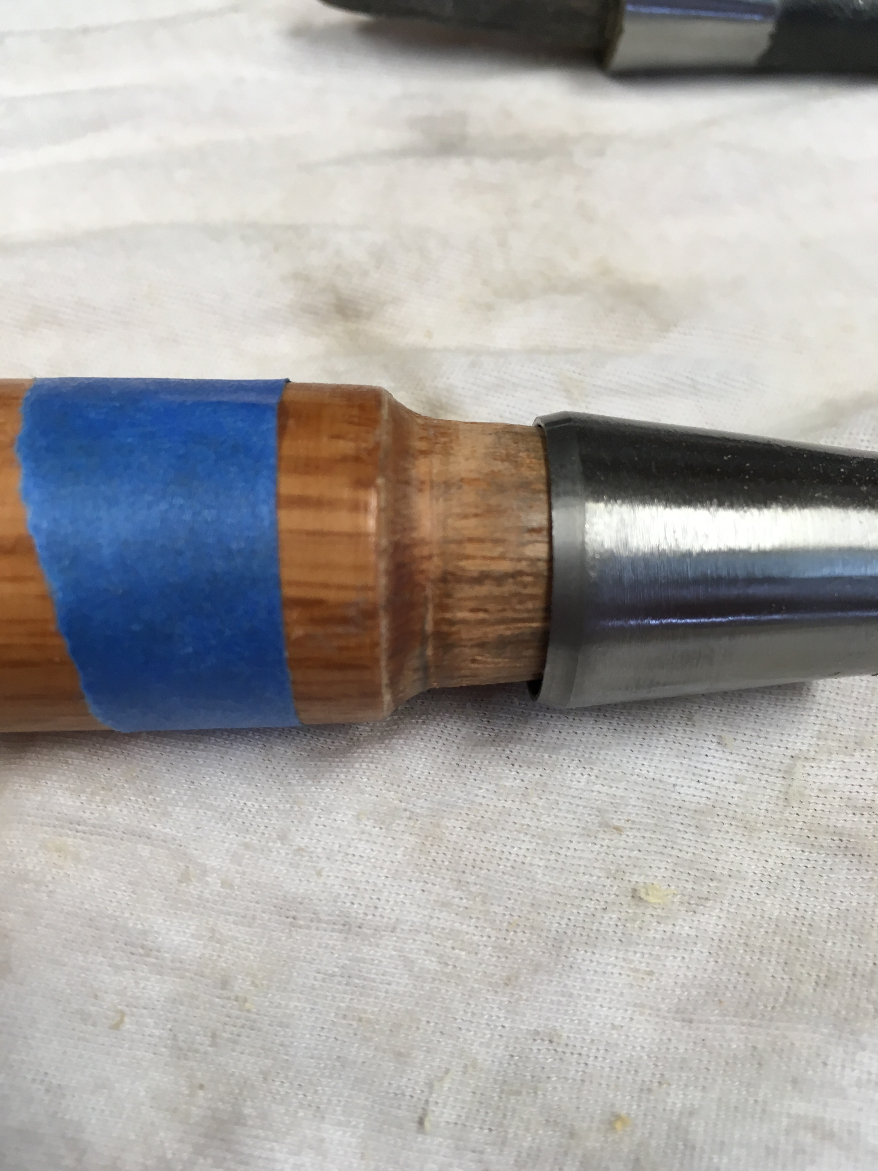 The stickers are cleaned away and I begin fitting the ferrule to the handle. The idea is to remove any material that will stop the ferrule from properly compressing the end of the handle.  It may seem like it’s fine now, but time and seasonal changes will cause the ferrule to move further up the handle.  Removing this material is discussed in Toshio Odate’s book and I was reminded of it while reading thru Brian Holcomb’s blog posts as well.  I used Brian’s suggestion of wrapping tape around the handle for a gauge line.