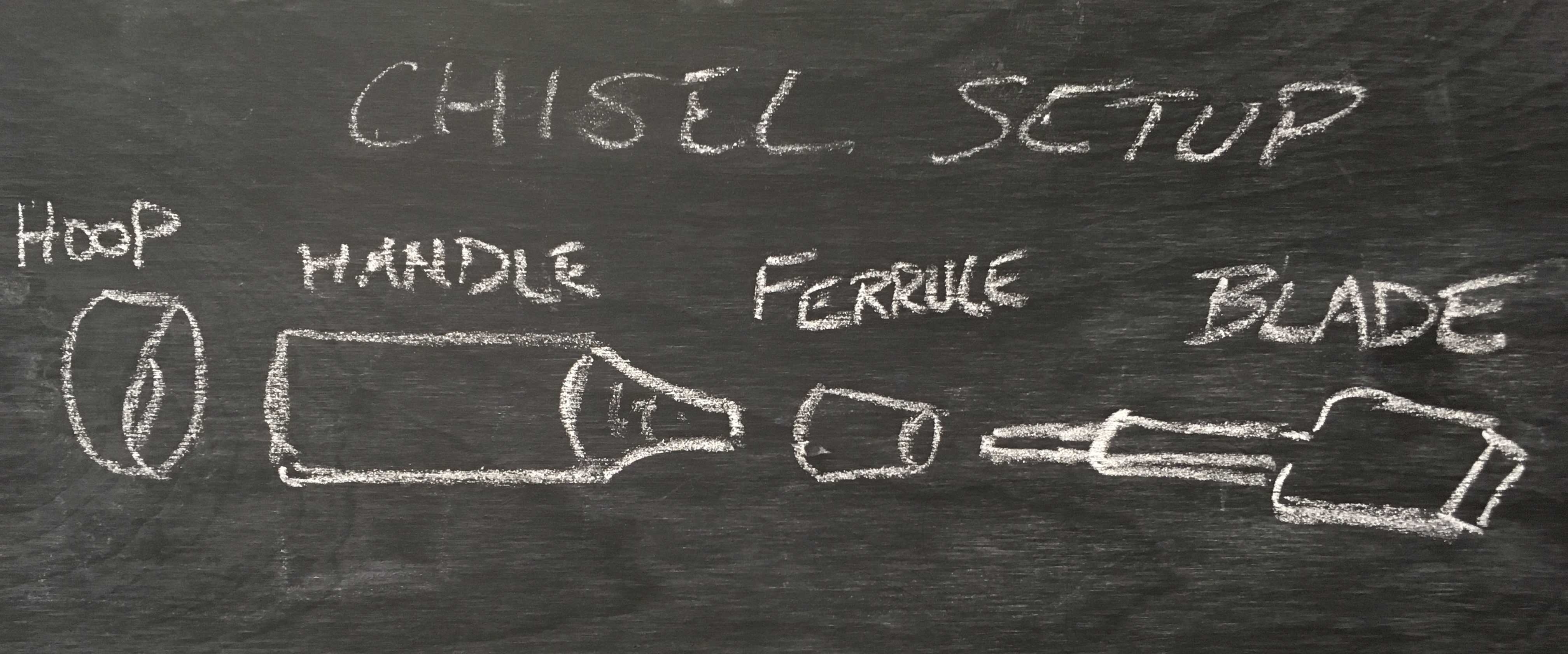 A Japanese chisel consists of four parts.  There is a blade, ferrule, handle and hoop.  The blade has a tang that is inserted into the handle.  This joint is reinforced by a metal ferrule.  The blade shoulders against the ferrule and the ferrule transfers compression into the handle.  The metal hoop at the top of the handle serves to prevent hammer blows from splitting the handle.  Historically these hoops are left loose by the maker and it is up to the end user to set the hoop before the chisel is put to use.