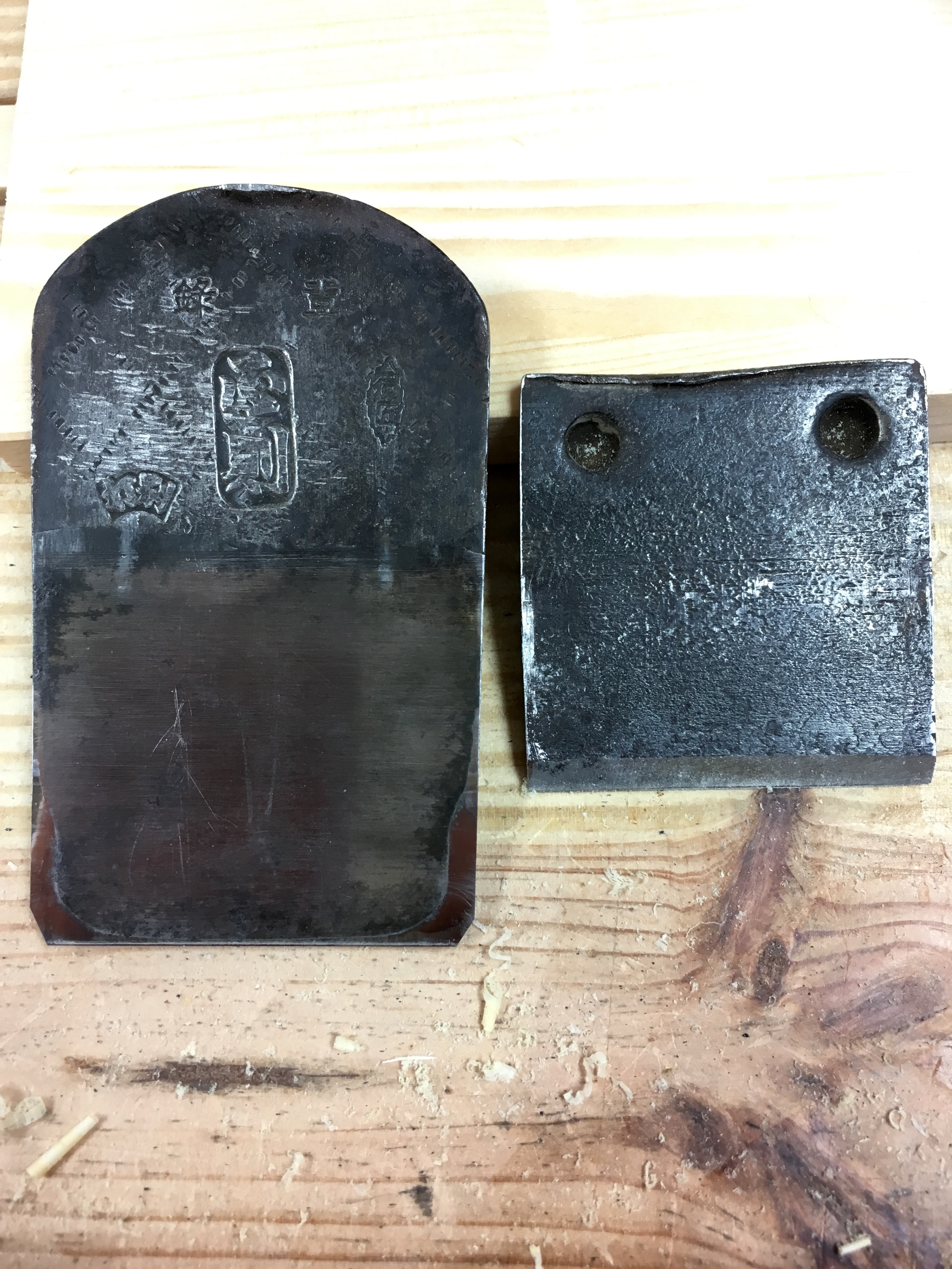 The eBay blade from Japan that I just received is by far the best of my three blades.  It doesn’t seem to have seen much use.  The seller guesses the blade is blue steel laminated to soft iron.  The brand name is Kuninori, but it is not signed by a blacksmith.  The chip breaker is a standard stamped steel affair, but works as intended.
