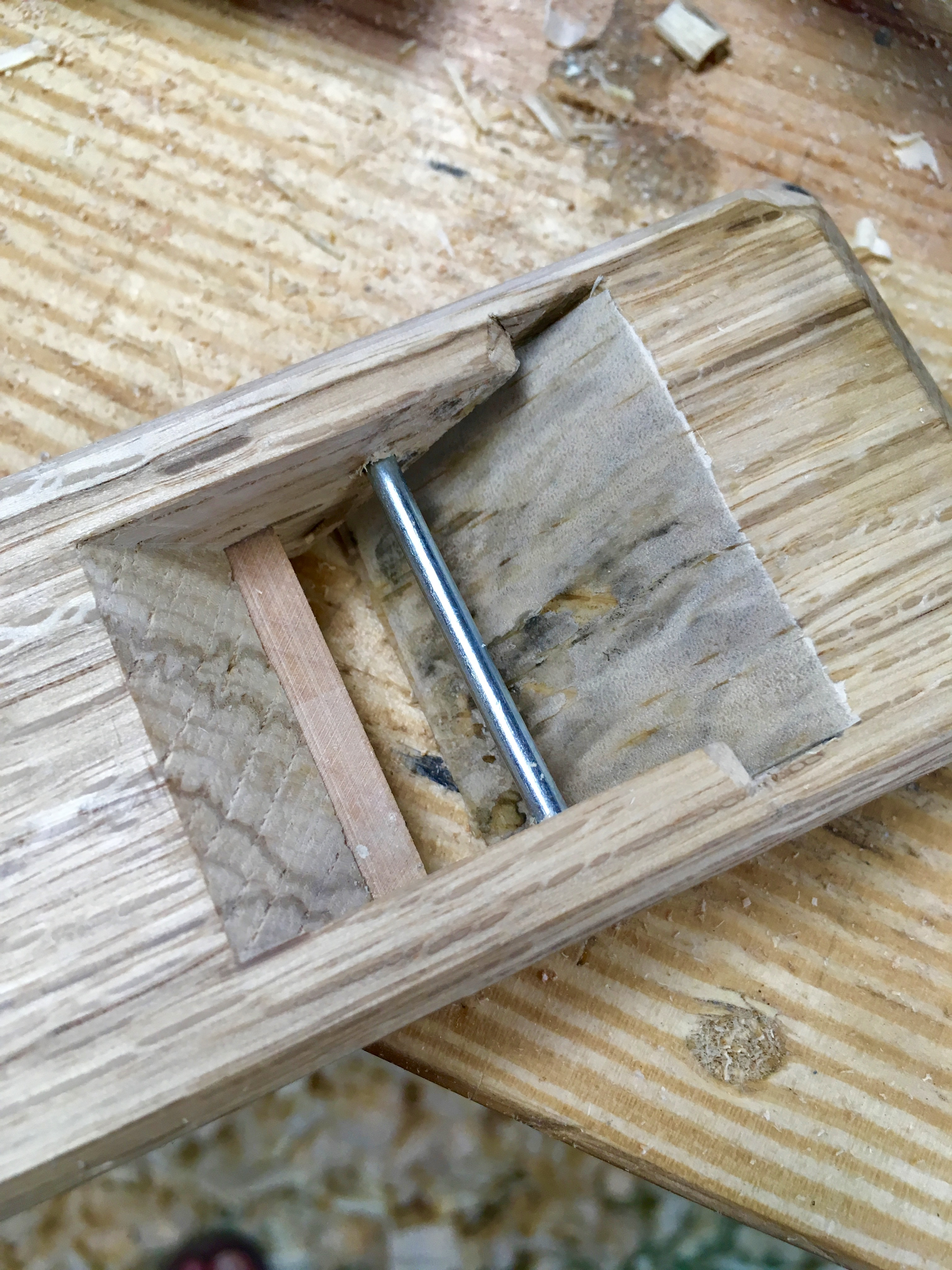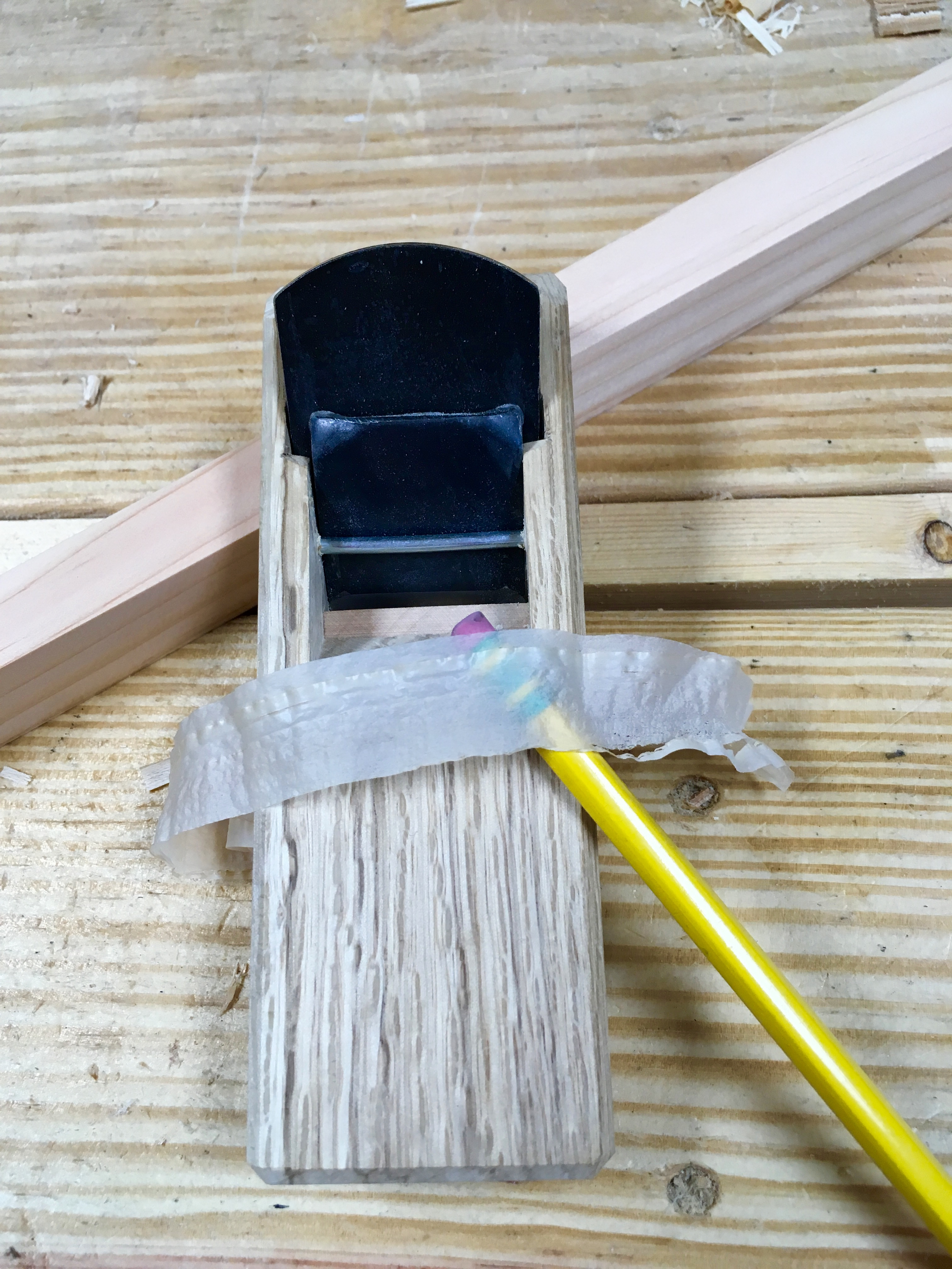 At this point the plane worked very well and would serve as a general purpose block plane, but….I wanted to go just a bit further.  To keep the flat blade from sliding straight through the plane, the manufacturer created a high point down the center of the dai bed.  Works great, but leaves the outer edges of the blade unsupported. This is not an issue for a standard thickness cut, but if you try to go to a finer cut you will get chatter and I did.  To remedy this I removed the high spot.  This, of course, made the blade fall through the block.  So I glued in a full-width shaving as a shim.  Now the blade doesn’t fall through and is fully supported.