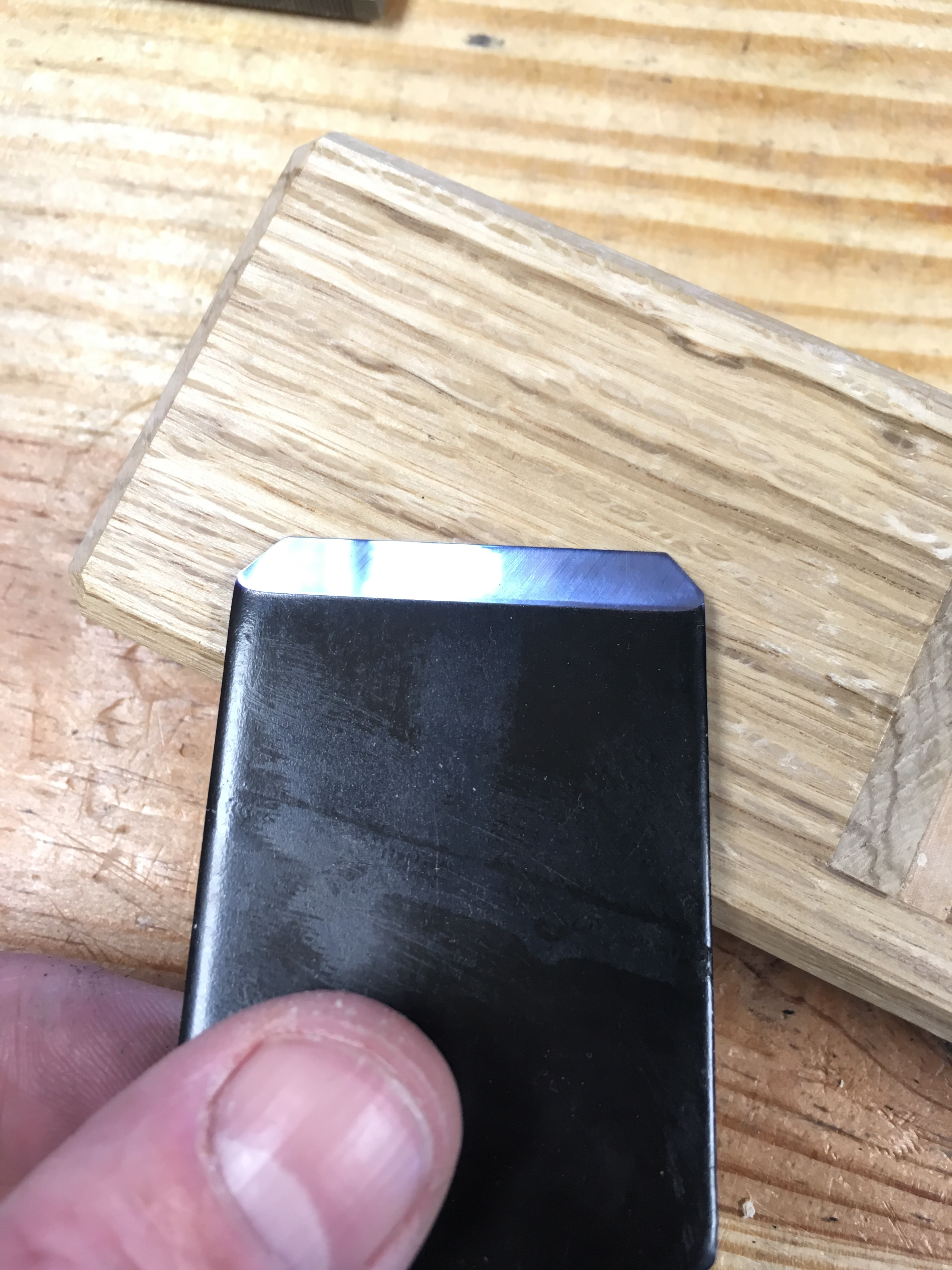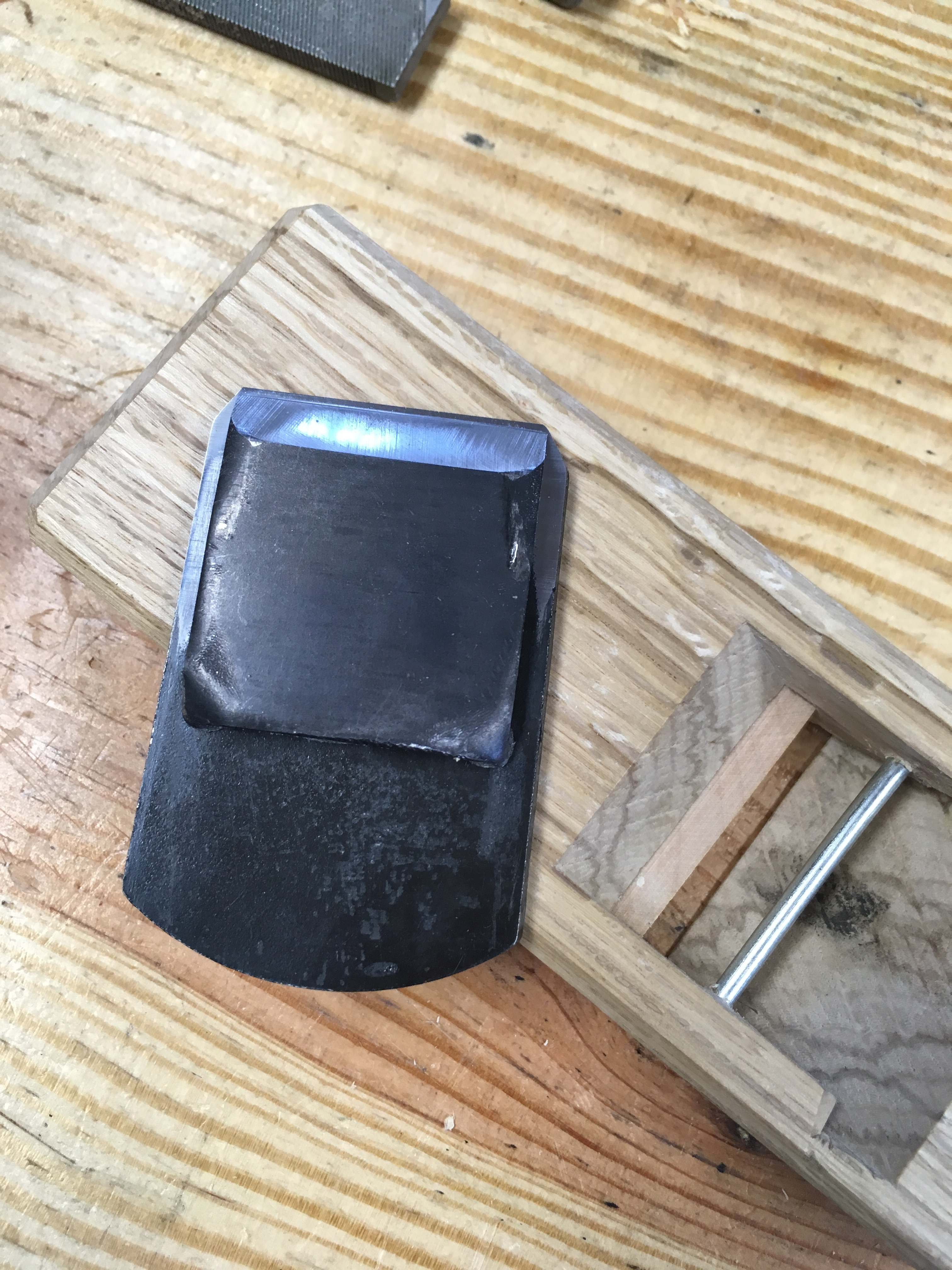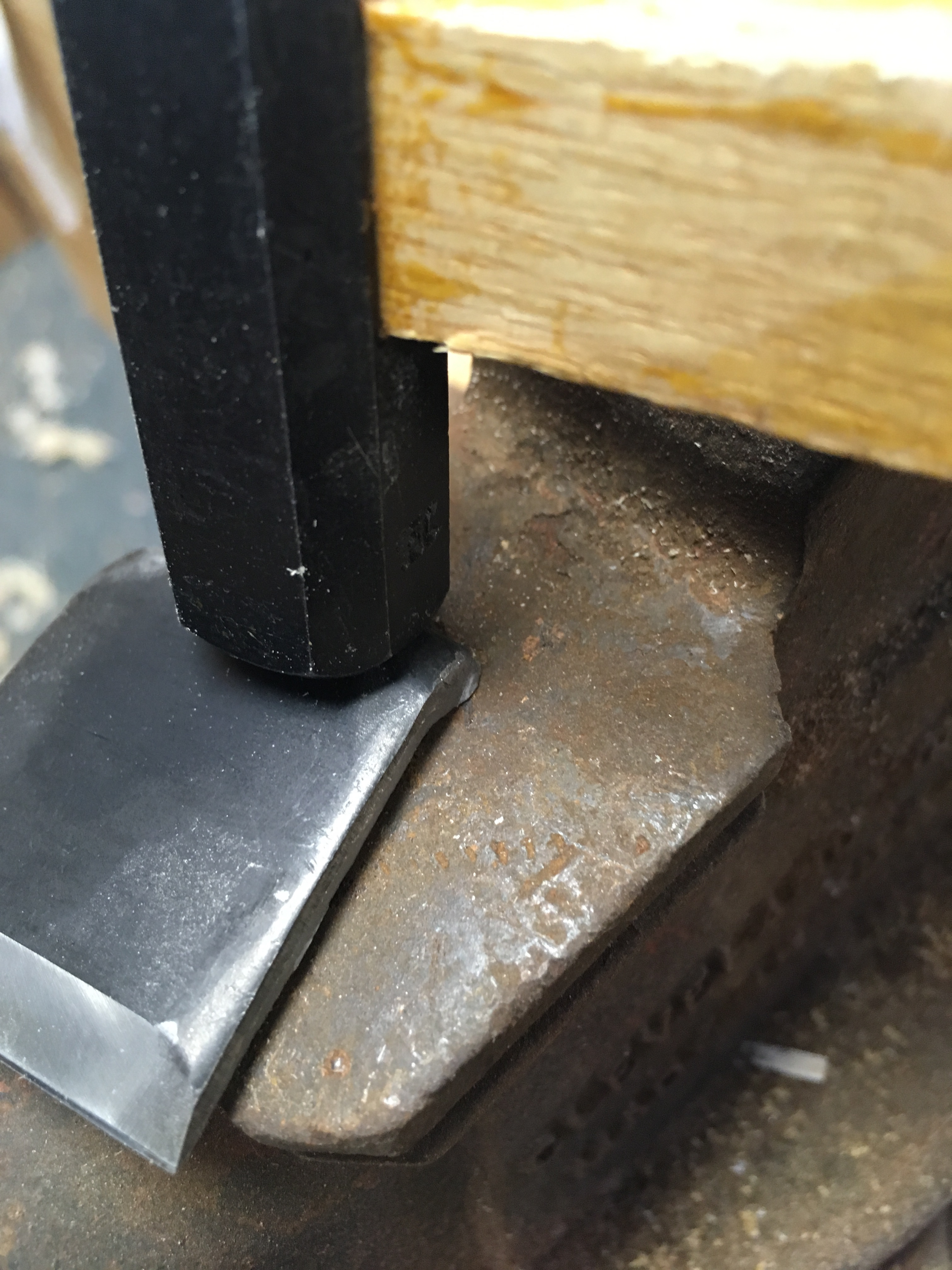 A typical Japanese kanna has a laminated blade that tapers in thickness.  It is this taper that wedges the blade into the dai block and the chip breaker plays little or no role in securing the blade.  In this plane the blade is a flat piece of steel and the chip breaker is used as a wedge to secure the blade.  The arrangement was very tight straight out of the package.  To loosen the fit slightly I simply reduced the bend in the “ears” of the chip breaker with a hammer blow or two.  I made sure that the adjusted chip breaker still sat squarely on back of blade with positive contact at the cutting edge.