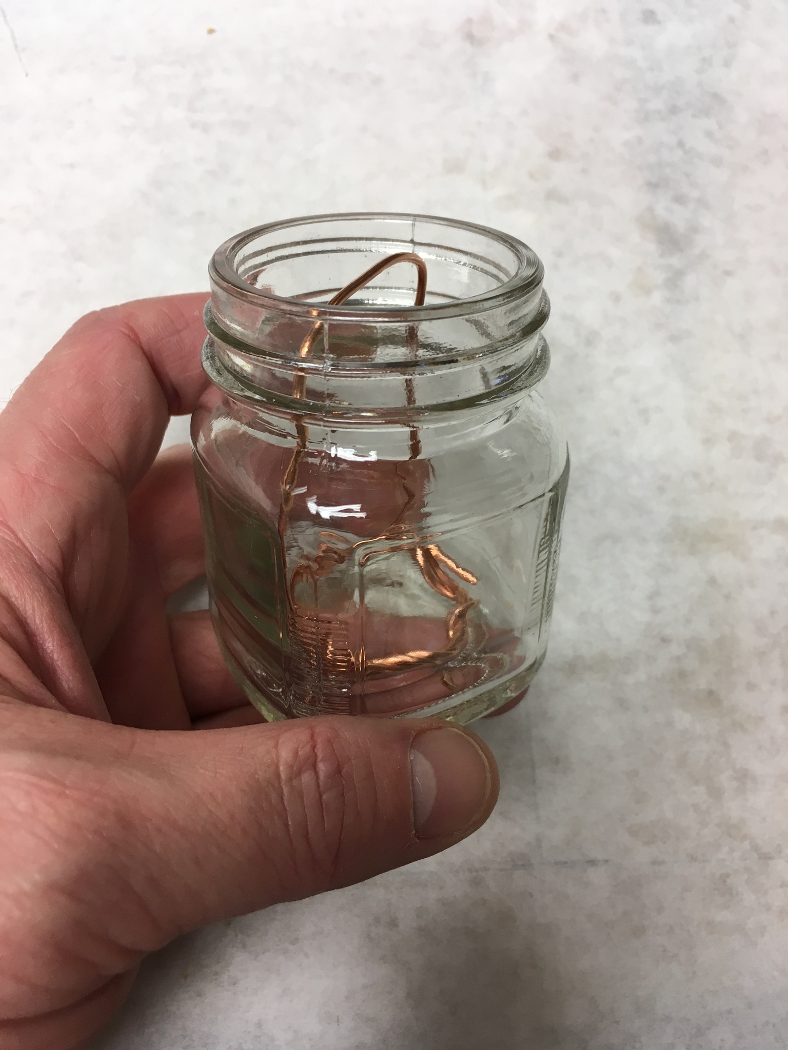 One other modification I made was to add a brush wipe to the glass jar.  I cut a length of copper electrical wire and removed the bare copper ground wire.  I then shaped the wire to fit down into the glass jar so that it created a wiping bar across the opening of the jar.  Supposedly copper has an anti microbial effect on the glue, at least there should be no adverse reactions on the glue as could be had with other metals.