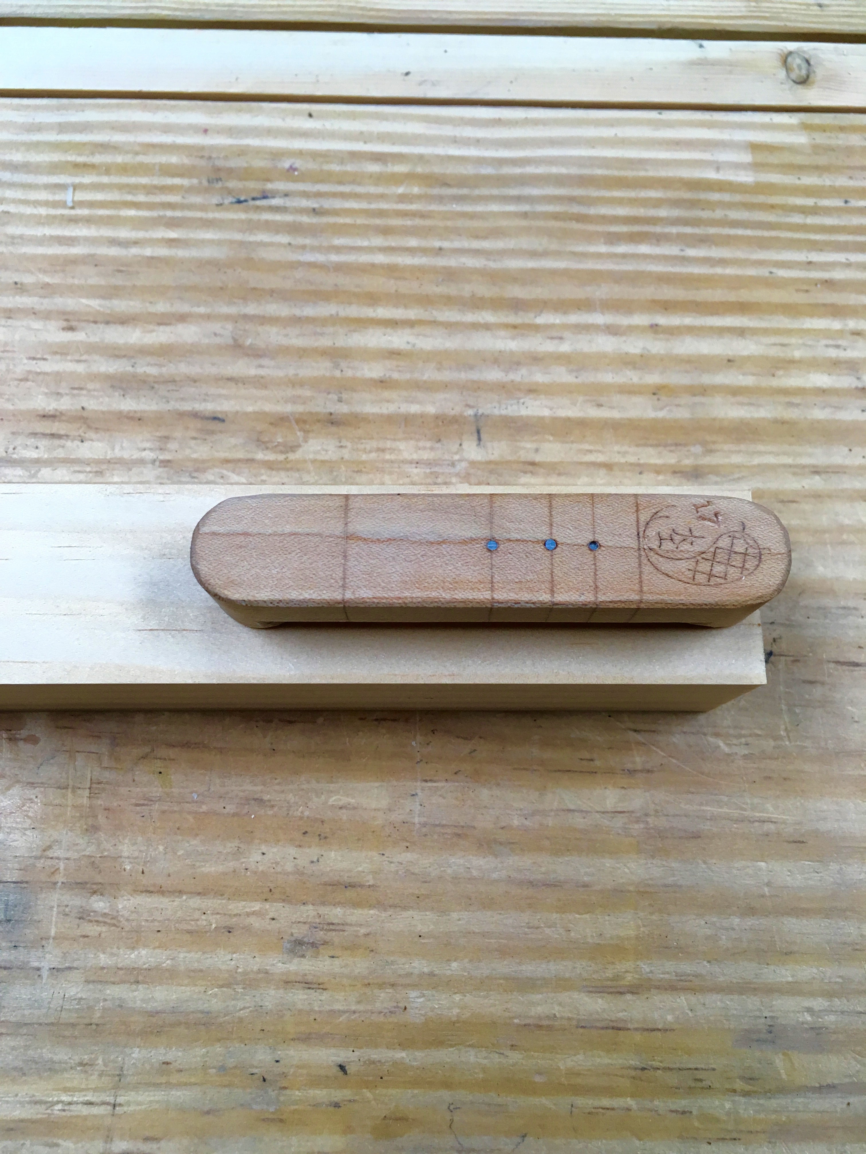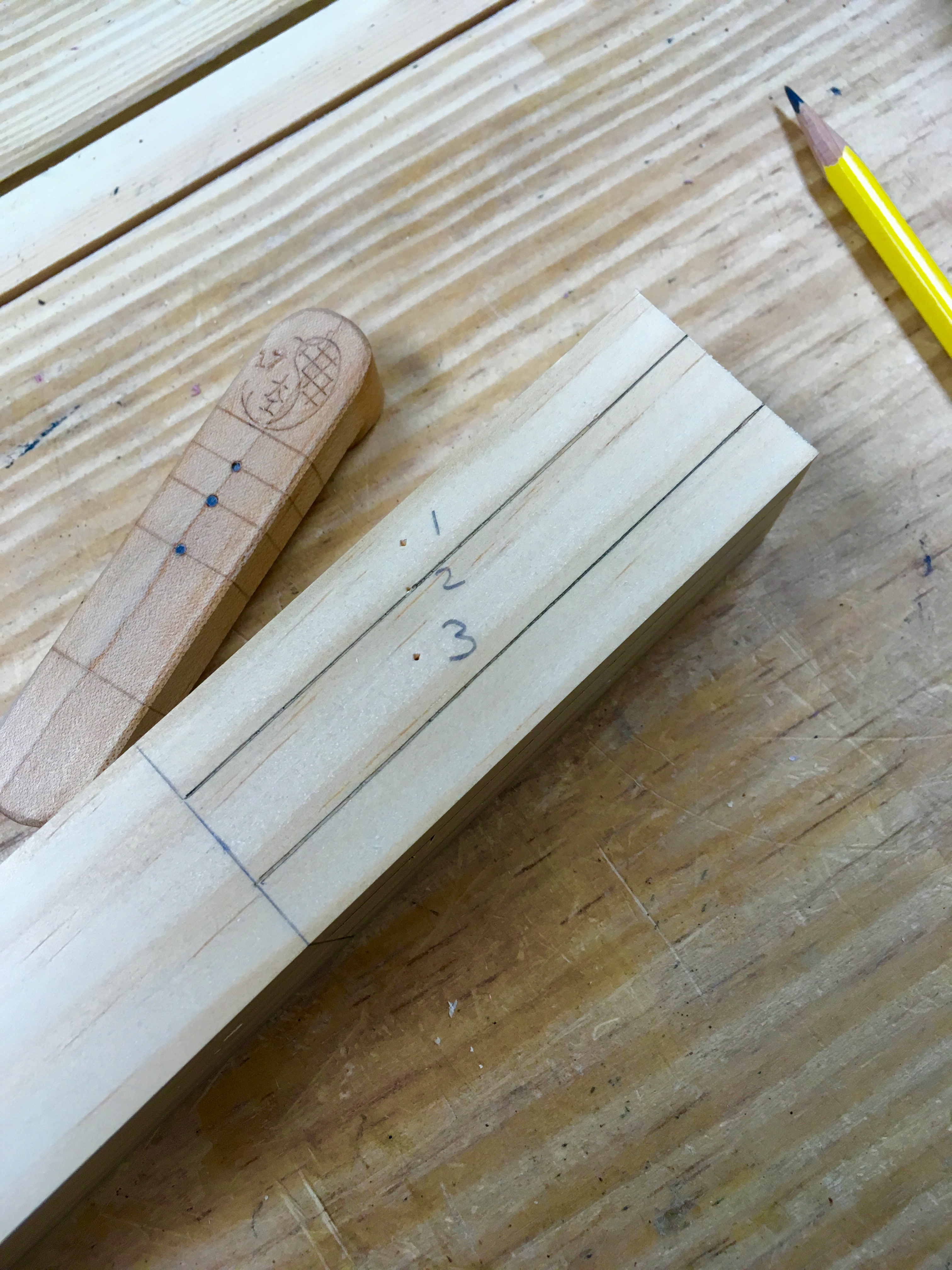 Then I register the gauge on the stock and press down firmly to generate three gauge marks.