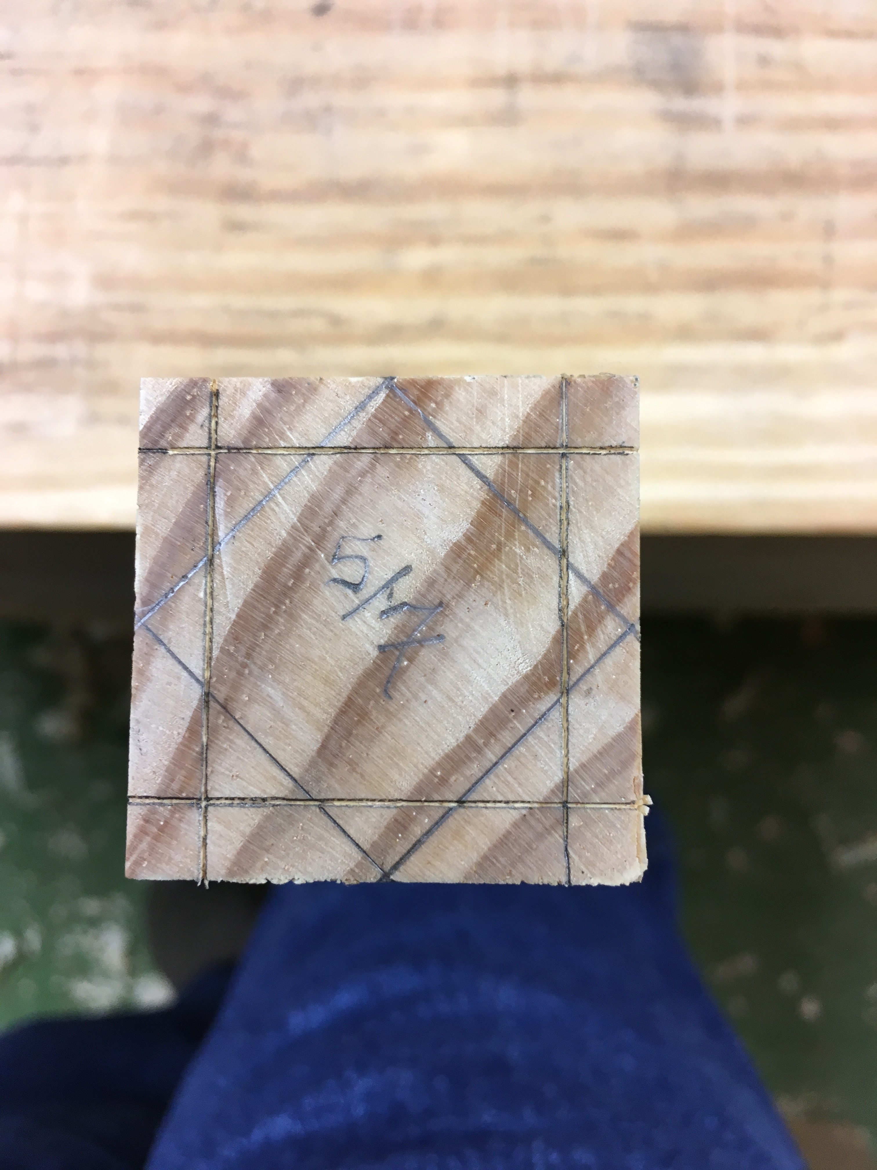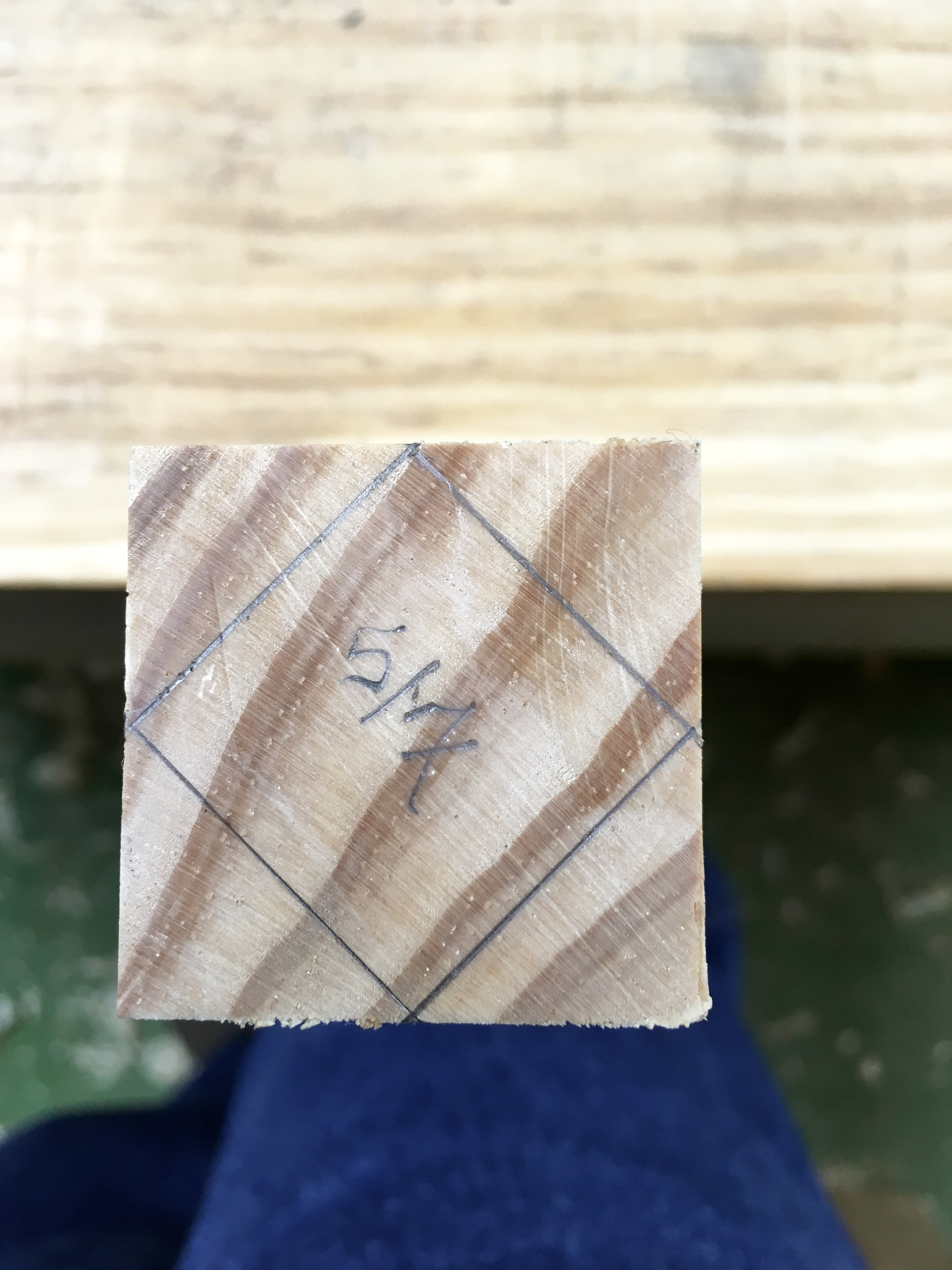 Doesn’t look like much, but it has a proportional relationship!  The smaller, rotated square is 5/7th the larger, original square.  So I tried laying out and cutting a leg using this rotated square method.  Worked great!  One round of layout and cutting was all that was needed.  So now I had a proportional way of laying out my legs.  Now, can I make it more standardized and faster to layout?
