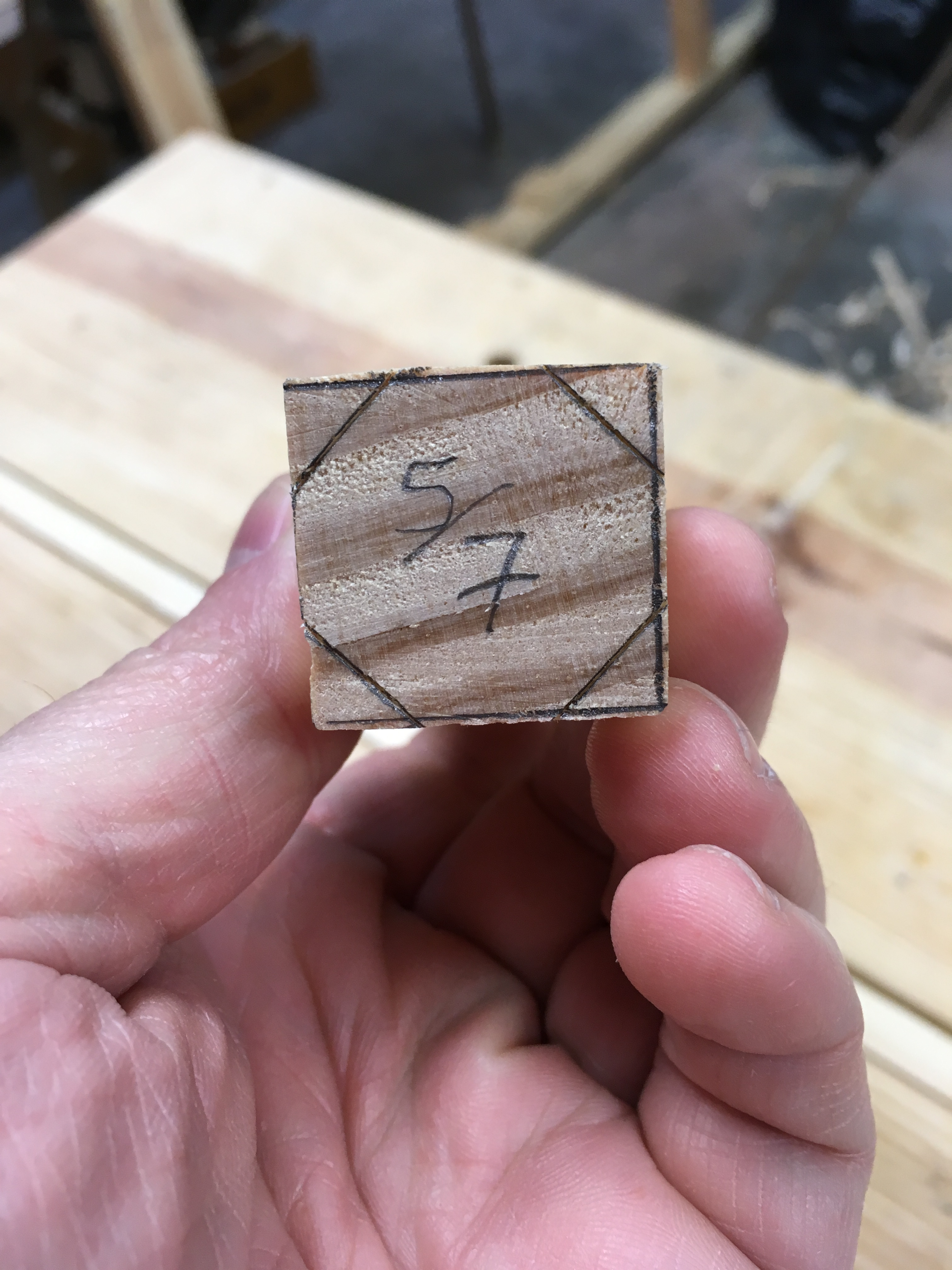 Depending on the number of legs that I am making, I’ll either set my finger gauge or use proper marking gauges set to those gauge points.  One for the corner of the full-width octagon, one for the 1/7th taper and possibly one for the center point of the face.