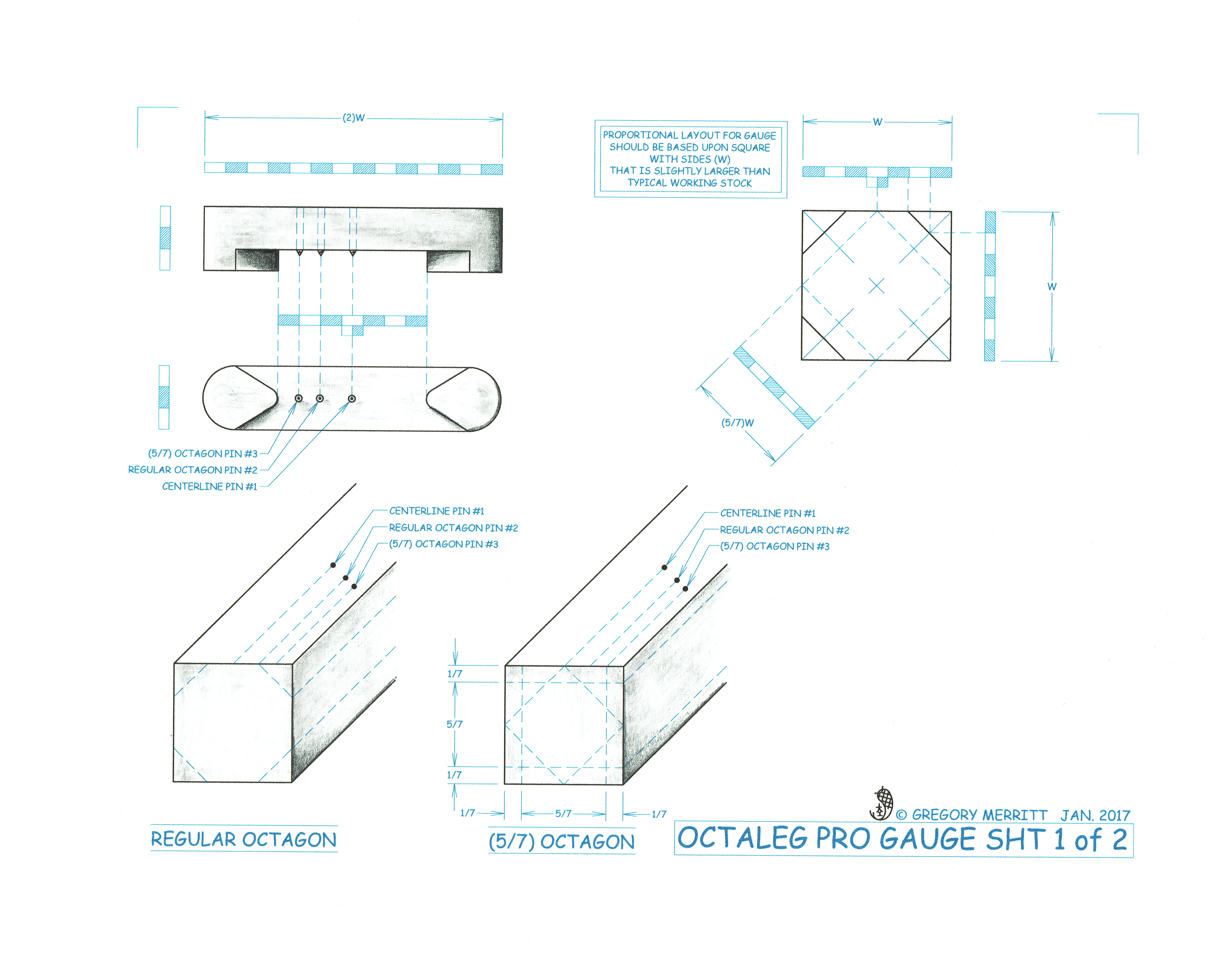 It was at this point that I became aware of the “octagonizer” and explored how to make it.  While working on the layout for the “octagonizer” something jumped off the page at me.  The “octagonizer” is really just a proportional gauge.  I should be able to add a pin 1/7th the distance from the guide pins and gauge the taper for my leg.  Sure enough, worked like a charm.  Hey, I need the center marked too.  Might as well add a pin for that too!
