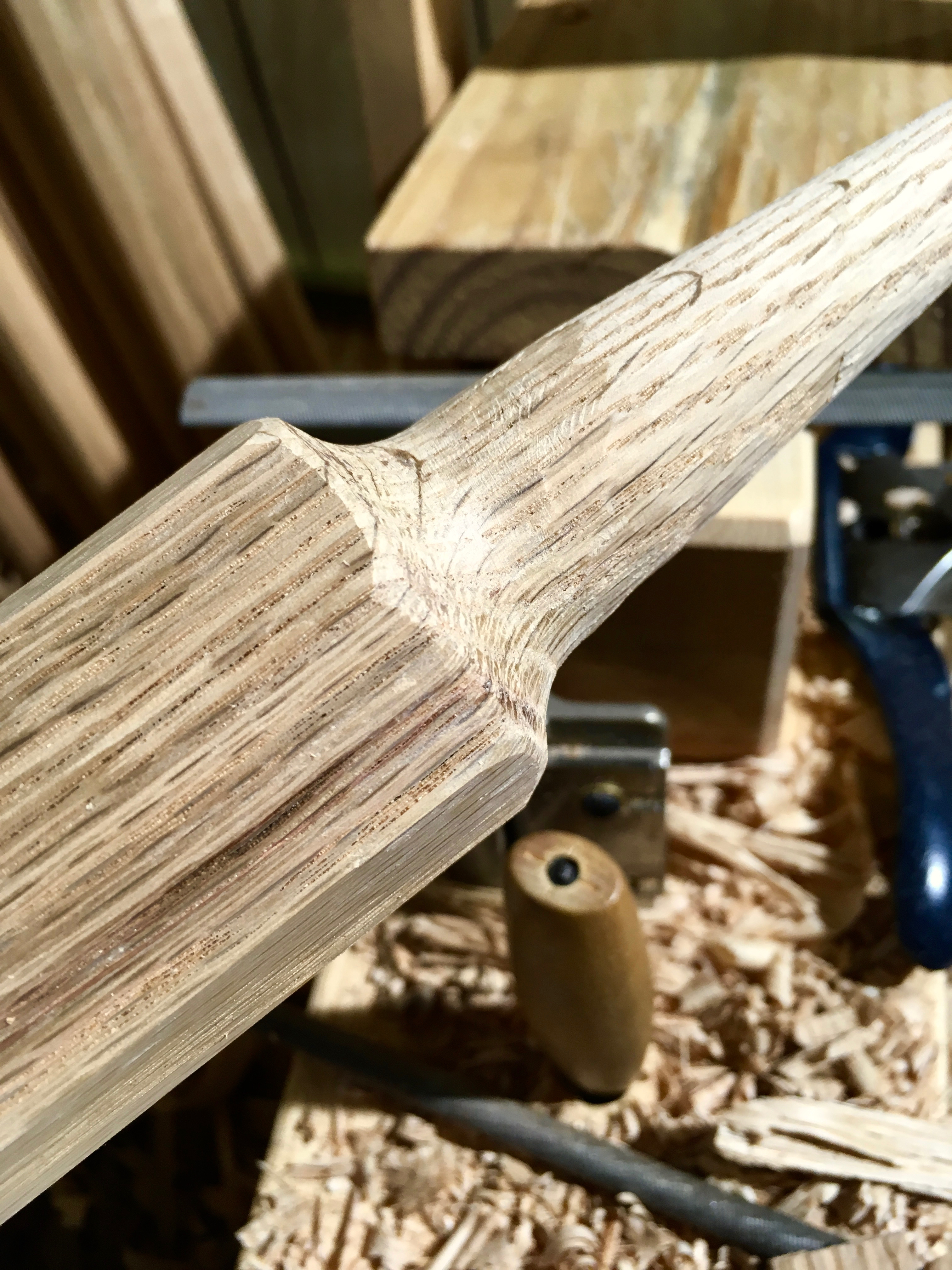 Cleaned them up with a plane and refined the transition from leg to tenon.  These are relatively thick legs and I wanted a cove transition from full-width to the base of the tenon.  Creating this cove on a lathe would take a matter of seconds, without a lathe it took a little bit longer.  I hogged most of the waste away working the drawknife with the bevel down for control.  I followed this with some carving knife work and finished with a half-round file.