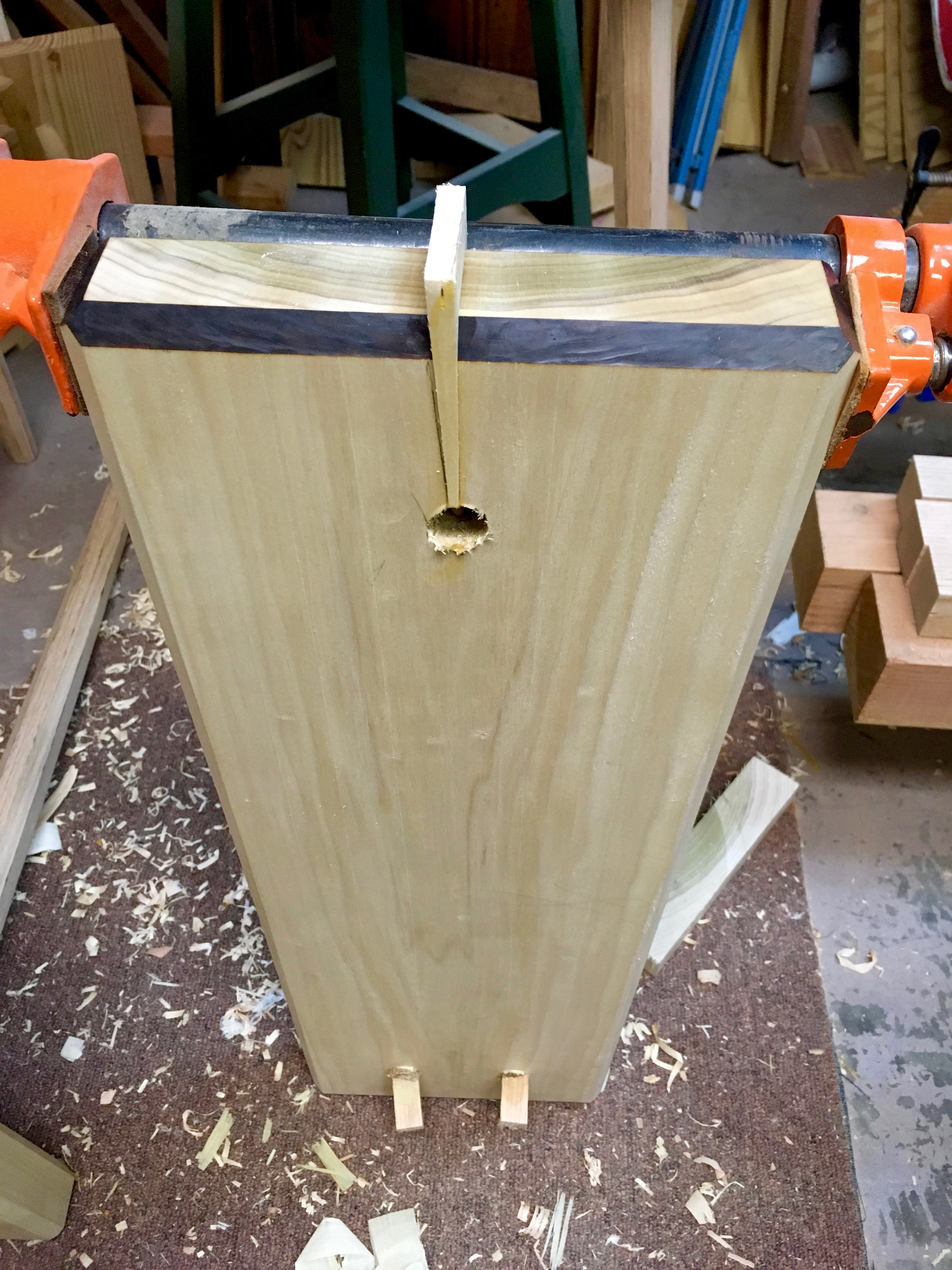 So what the heck happened?  All of my previous staked projects were either laminations of SYP or plywood.  A solid slab of poplar reacts differently than either of those.  Using a heavier hammer made judging the progress of the tenon advancing into the socket hard to judge.  The force of each blow was quite a bit more than those with my lighter hammer.  Finally, my changing wedge shapes allowed the wedge to advance too deep into the tenon.  Actually, I was lucky with most of them, they were thick enough to tighten before going too deep.  The last wedge was slightly thinner and I paid the price.