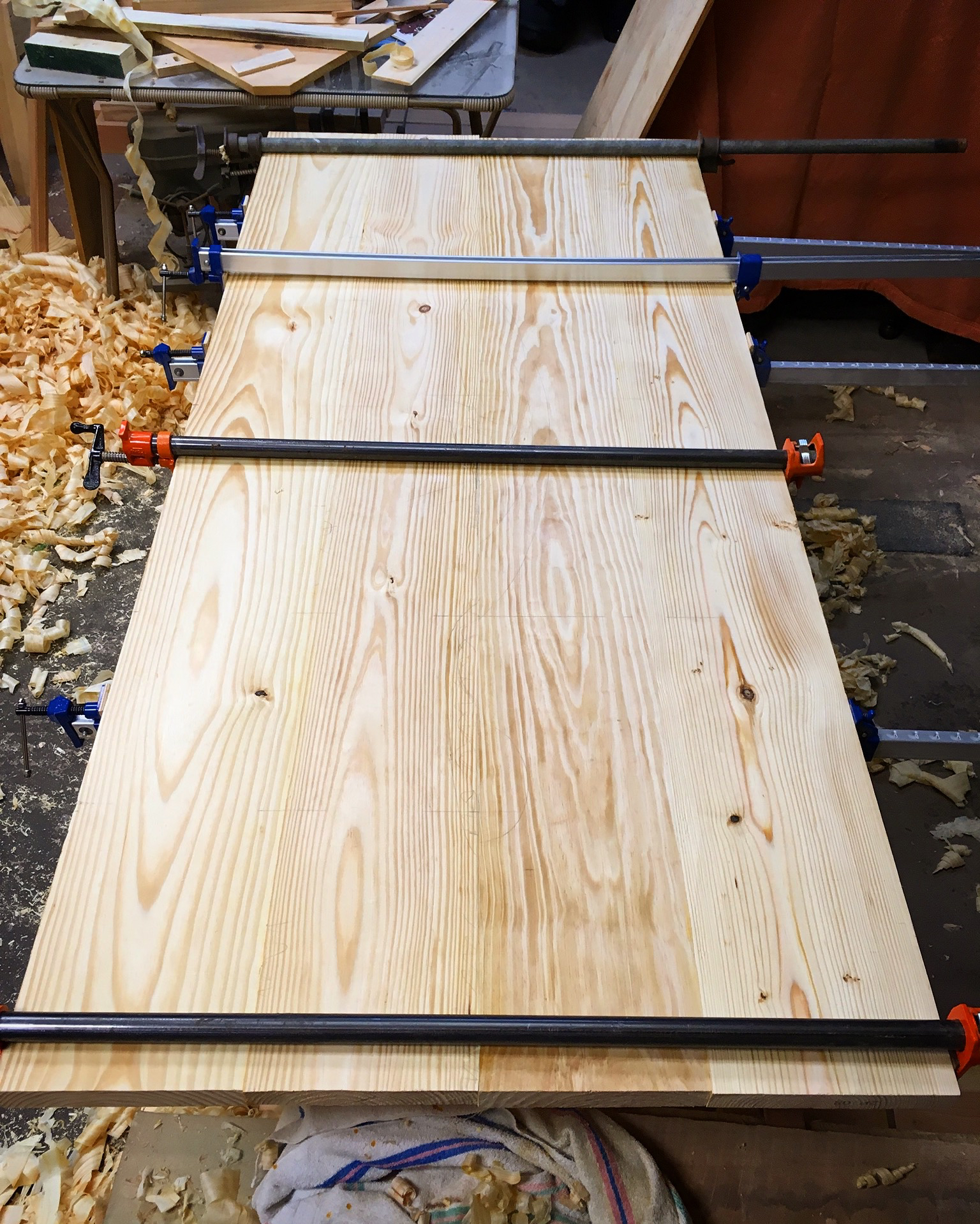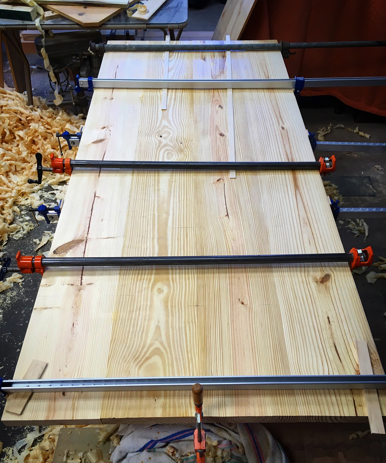 Almost every evening after work I worked on getting the table tops together. I continued my method of flattening one face and squaring an edge on each board. Then glueing up two boards at a time. I actually got pretty good at it. I could prep two boards, add the alignment biscuits and have them in the clamps in about an hour and a half. That is how my week went. By Friday I was ready to assemble the first top.