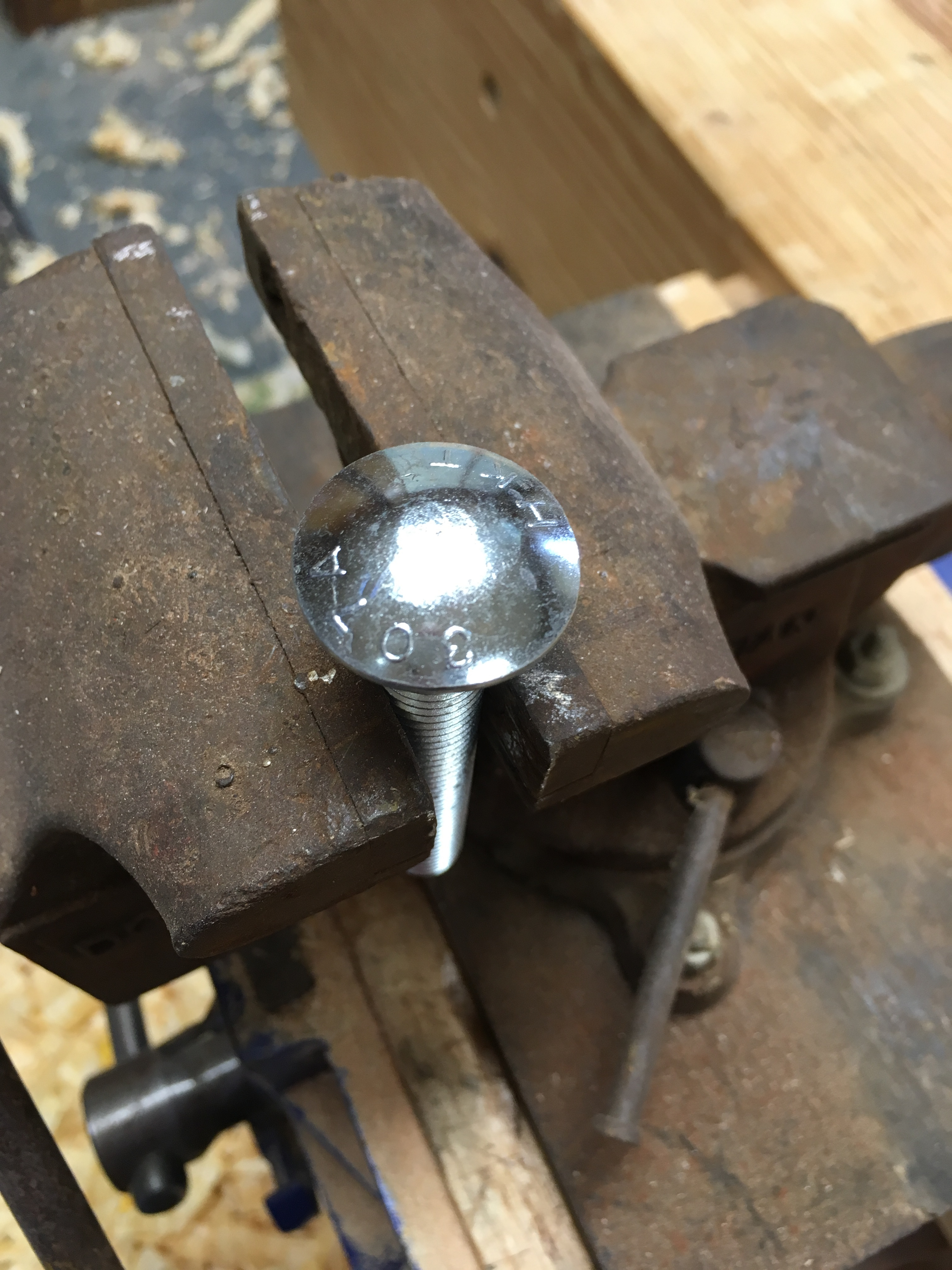 Since I wanted each top to cure for a full 24hrs, I turned the remainder of my Saturday to working on hardware for attaching the tops to the trestles. In his book, CW used a large wooden screw for attaching his top to the trestles. An elegant solution, but a quality tap and die set, such as the set he used, is spendy. Yes, there are much more inexpensive versions. The reviews for those seem to be less than favorable. Anyway, my solution is to use carriage bolts and wing nuts. I’ll use two per trestle and make sure to allow for any wood movement. Plus I can easily get these from the big box store. The only issue is that they are bright and shiny and this just looks wrong for furniture.