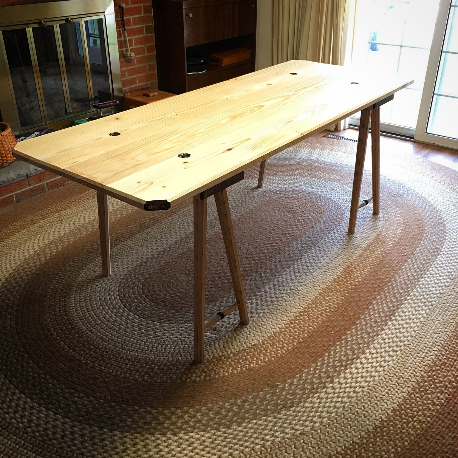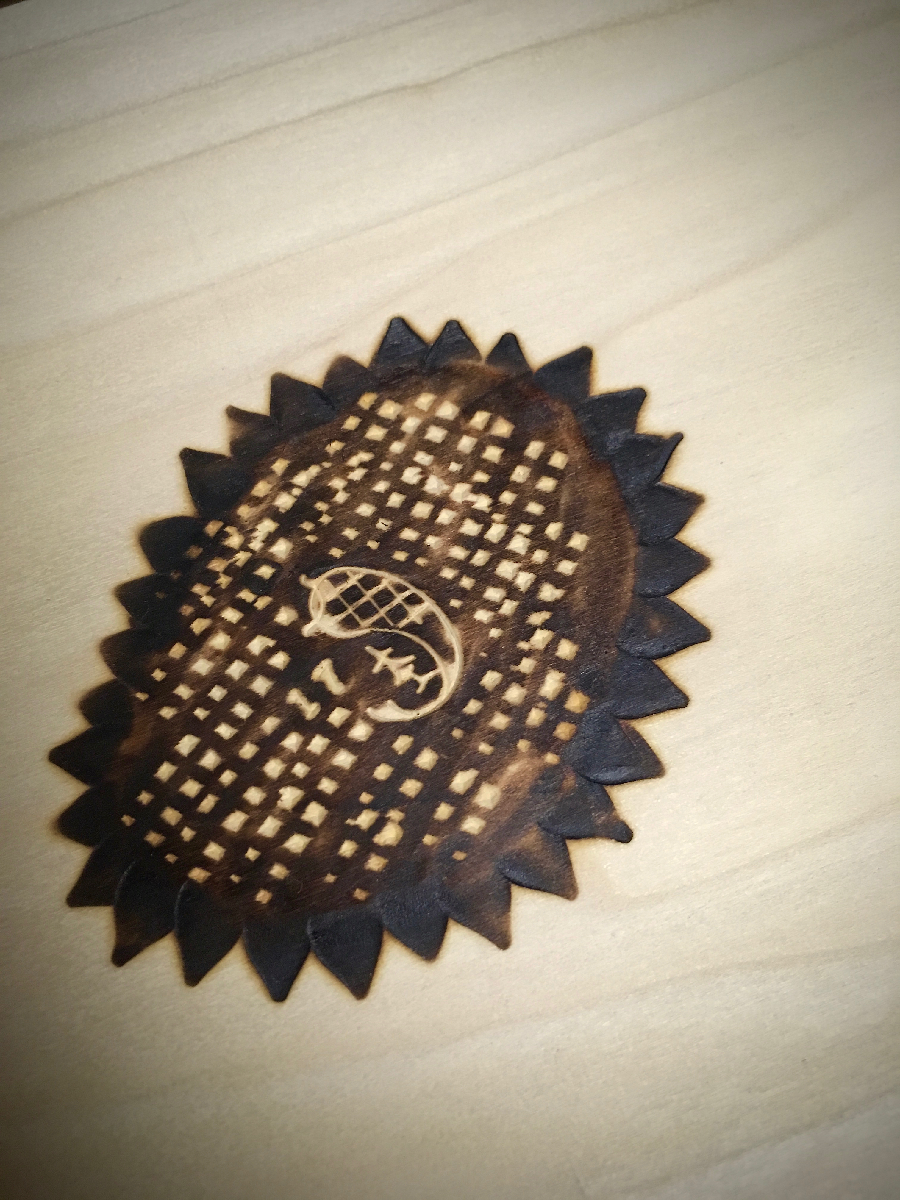 I did a little work on the trestles for this top as well. If you remember, I had a couple splits that needed repaired. The repairs worked out fine, but their visibility was wearing on me. So I broke out my stamping tool and added some texture to the ends of the trestles and followed up with the wood burning tool.
