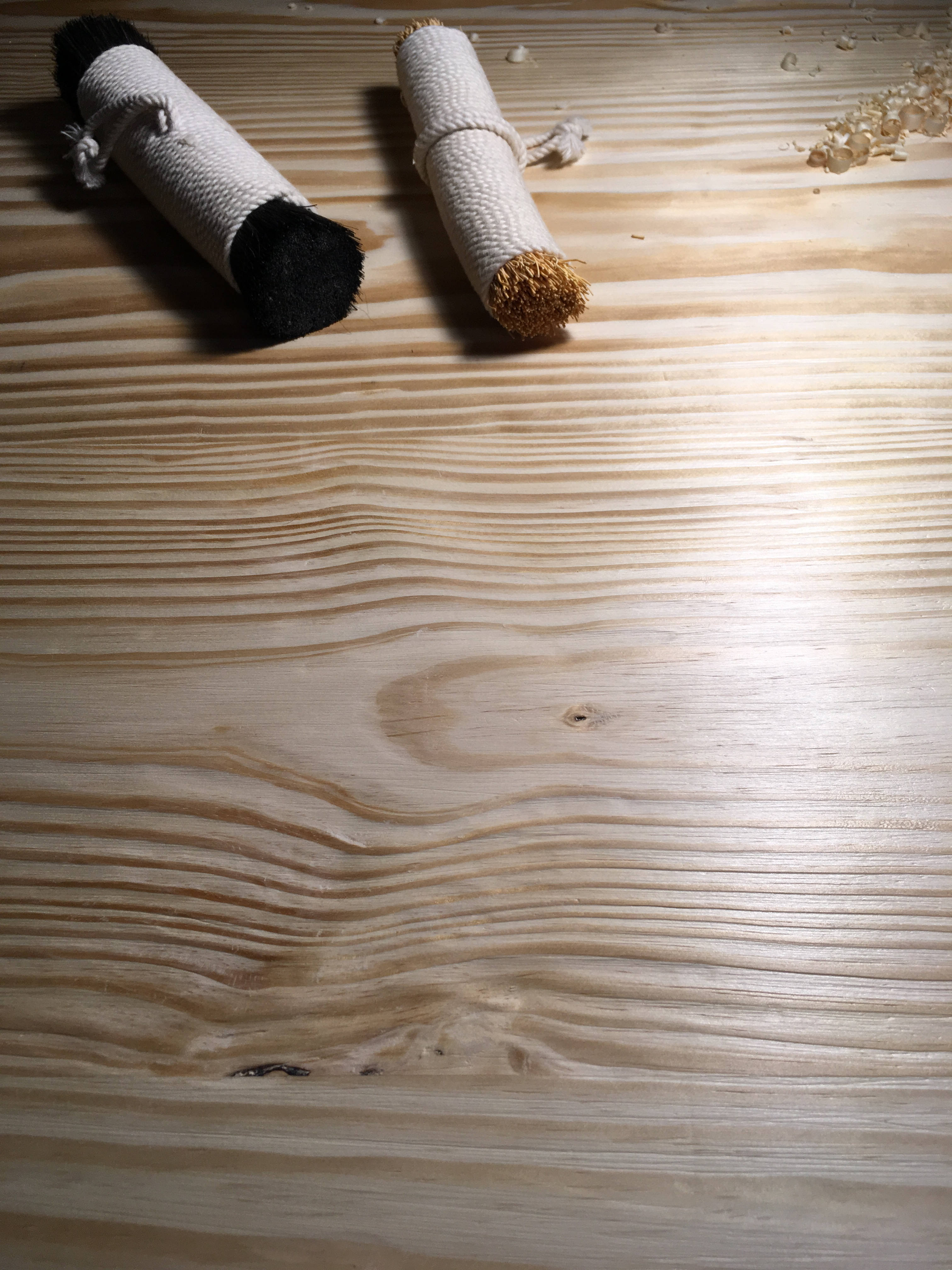 Most of my attention this week was focused on getting the first tabletop ready for finish. I could have just went with the planed surface. Except for a few troublesome areas, the top was smooth, but a little boring to my eye. Admittedly, I had planned to treat this top with the uzukuri technique. Essentially an abraded and burnished finish treatment created with “brushes” of varying coarseness. The abrading action lowers the less dense (early) wood from the harder (late) wood. Subsequent finer “brushes” further refine, as well as burnish, the surface. I also used a couple of gouges to further deepen the effect here and there. The resulting surface is much like polished driftwood. The technique isn’t difficult, but takes time. Plus you are never really done. At some point you just have to stop.